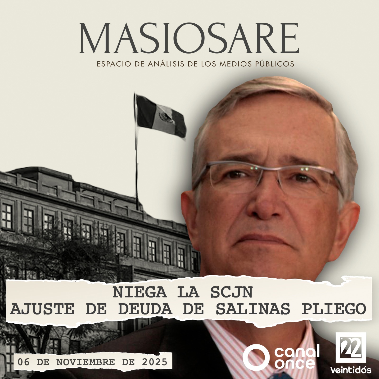 Masiosare es la barra de opinión de los medios públicos donde se discutirán y analizarán los temas que ocupan a la vida pública nacional e internacional, desde el periodismo, la economía, el derecho, los discursos y la historia. Esta noche nuestros panelistas Izcalli Fuentes, Meme Yamel, Alonso Romero y Elisa Godínez hablarán sobre las coyunturas actuales: el “Movimiento del Sombrero” y la negativa de la SCJN de aplazar juicios fiscales de Salinas Pliego.