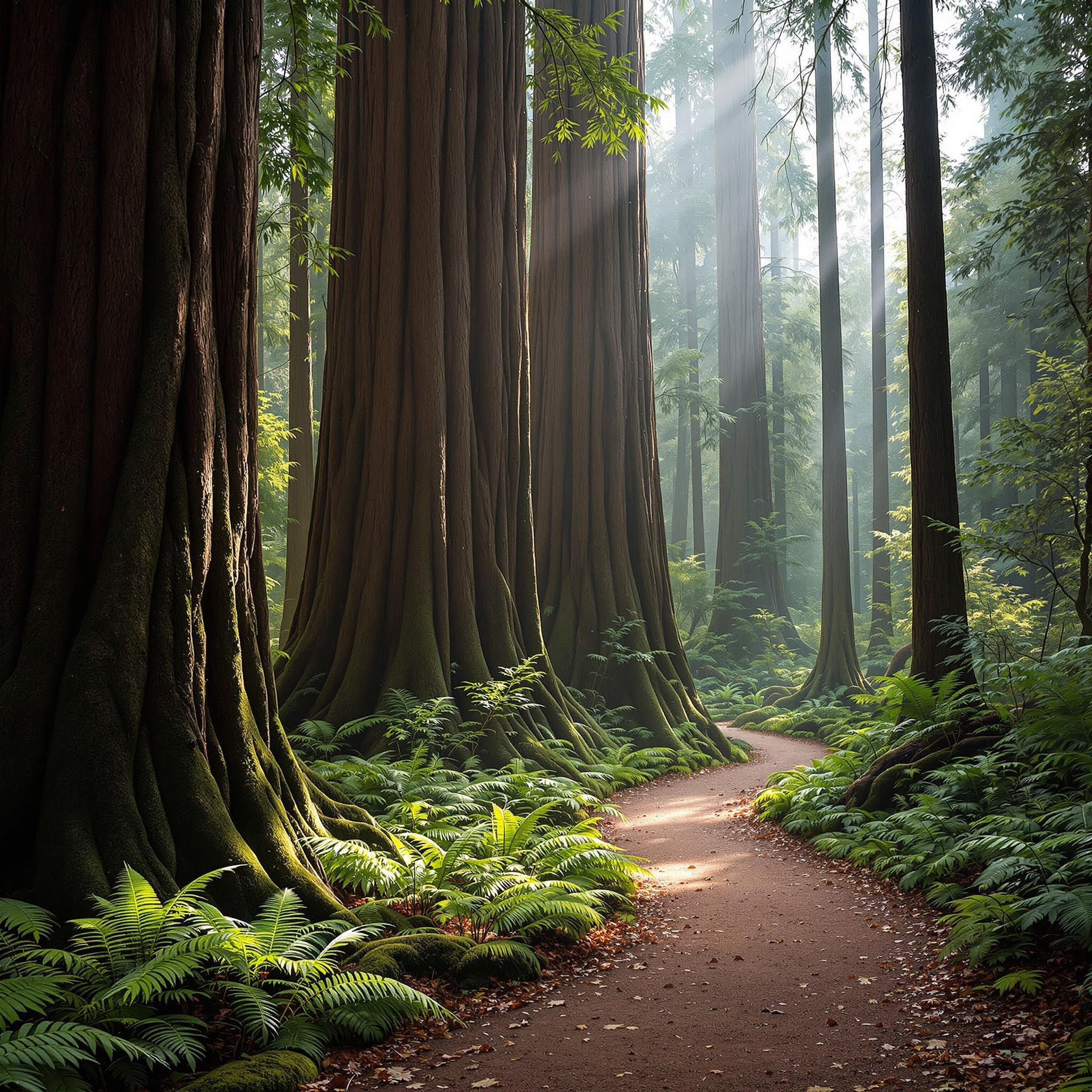 🌲 Step into the peaceful silence of an ancient redwood forest, where towering giants have stood for centuries, holding space for your deepest rest. Follow winding earthen paths beneath a cathedral of emerald canopy, where filtered sunlight dances through the mist and time seems to slow to nature's gentle rhythm. 🌿