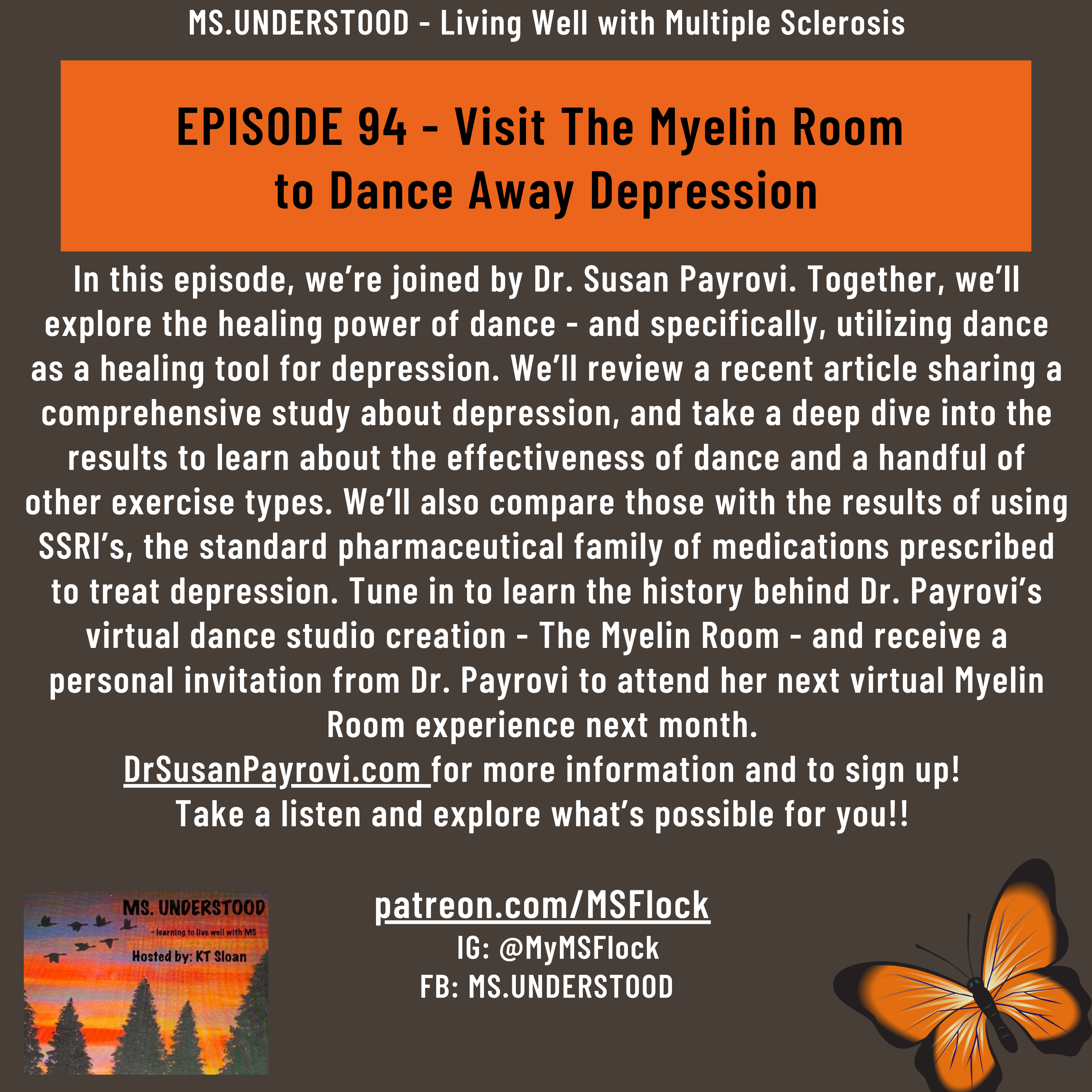 In this episode, we’re joined by Dr. Susan Payrovi. Together, we’ll explore the healing power of dance - and specifically, utilizing dance as a healing tool for depression. We’ll review a recent article sharing a comprehensive study about depression, and take a deep dive into the results to learn about the effectiveness of dance and a handful of other exercise types. We’ll also compare those with the results of using SSRI’s, the standard pharmaceutical family of medications prescribed to treat depression. Tune in to learn the history behind Dr. Payrovi’s virtual dance studio creation - The Myelin Room - and receive a personal invitation from Dr. Payrovi to attend her next virtual Myelin Room experience next month. DrSusanPayrovi.comfor more information and to sign up! Take a listen and explore what’s possible for you!! patreon.com/MSFlock