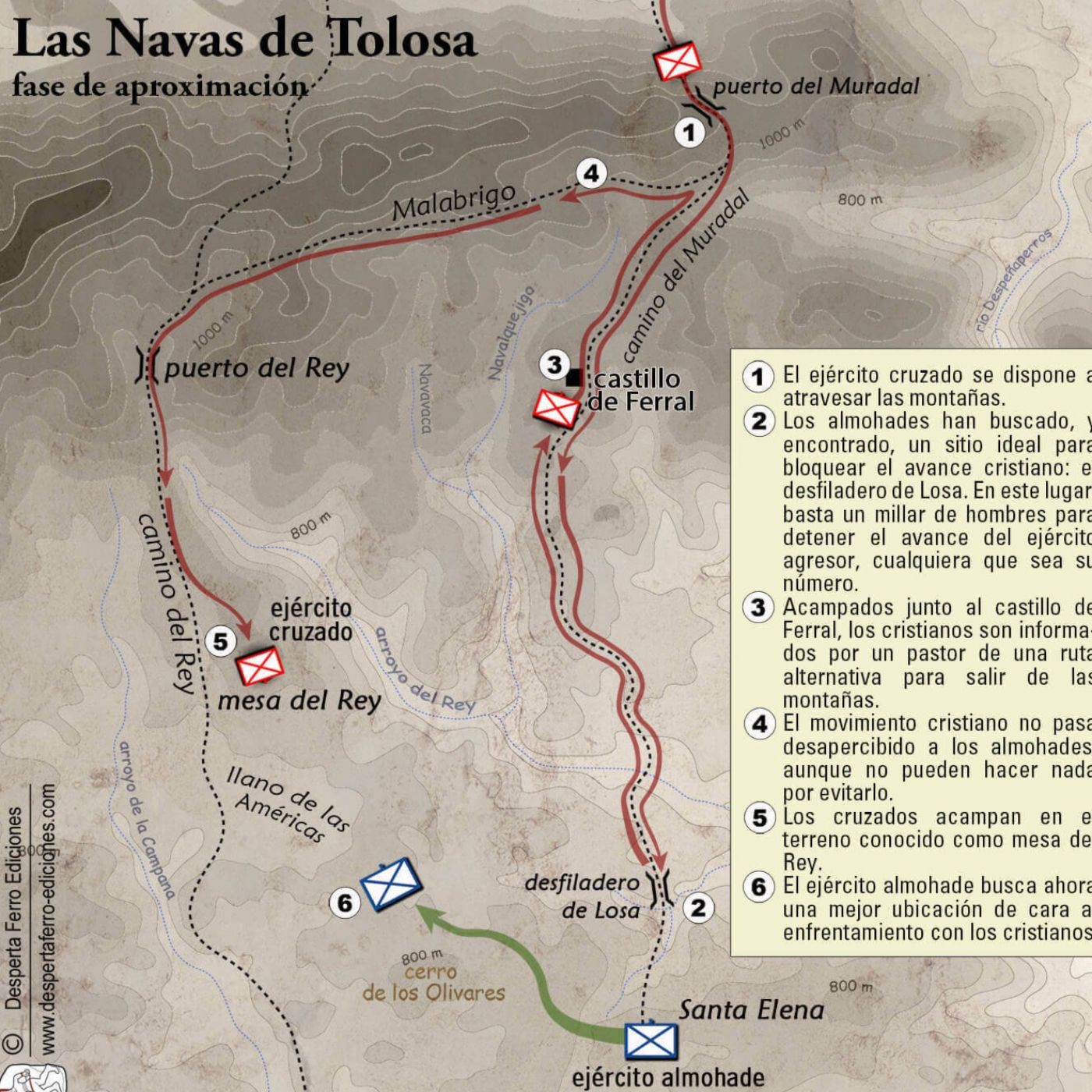 El lunes, 16 de julio de 1212, con las primeras luces del día, cerca de la actual localidad de Santa Elena (Jaén), dos grandes ejércitos se dispusieron cara a cara para iniciar un choque campal que se convertiría en uno de los grandes hitos militares de la historia de la Reconquista, un acontecimiento extraordinario que acabaría conociéndose como la batalla de Las Navas de Tolosa. La Batalla de Las Navas de Tolosa fue un enfrentamiento militar que tuvo lugar el 16 de julio de 1212 en el territorio de Las Navas de Tolosa, en el actual municipio de Santa Elena, en la provincia de Jaén, España. Fue un acontecimiento clave durante la Reconquista de la península ibérica, en la que los reinos cristianos de la península se enfrentaron a los ejércitos del califato almohade. En esa época, el califato almohade gobernaba gran parte del sur de la península ibérica y estaba en expansión. Los reinos cristianos, entre ellos Castilla, Aragón y Navarra, se unieron en una coalición liderada por el rey Alfonso VIII de Castilla para hacer frente al avance almohade y defender sus territorios. La batalla fue feroz y sangrienta. El ejército cristiano, compuesto por tropas de infantería y caballería, logró vencer a las fuerzas almohades, que también contaban con una gran cantidad de soldados y una fuerte caballería.