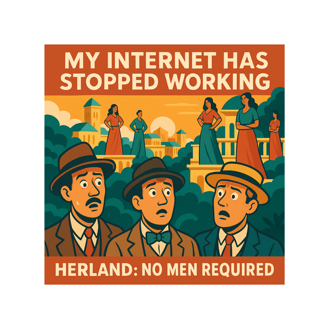 Herland is about three clueless guys—Van, Jeff, and Terry—who discover a hidden society of women living without men for 2,000 years. These women reproduce through parthenogenesis, meaning no men required. The guys think they're about to be heroes, but the women have built a peaceful, efficient society and don't need saving.