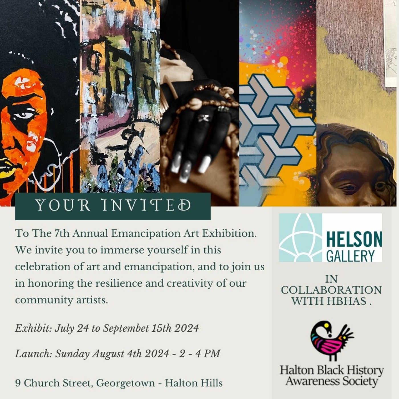 Art family and friends, you’re Invited to the 7th Annual Emancipation Art Exhibition happening this summer on Sunday, August 4th. We gather at the Helson Gallery from 2-4 PM for the launch to celebrate the rich tapestry of art and culture, and to honour the profound spirit of emancipation that resonates within the art we’ll see on display. The exhibit runs from July 24 th to September 15th and we look forward to seeing you there.