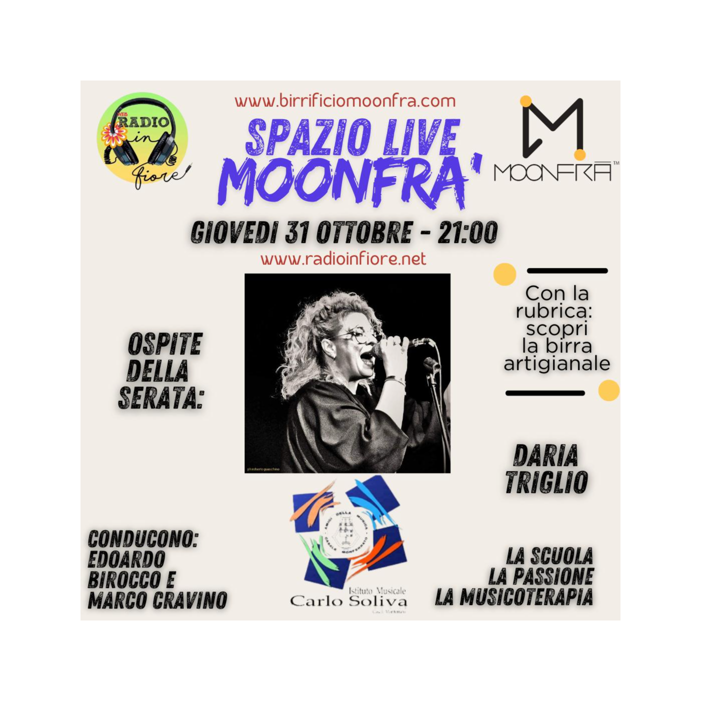 SPAZIO live MOONFRA' con Daria Trìglio & Teto- conducono Marco Cravino e DesmonDodo, serata del 31 ottobre 2024 al birrificio Moonfrà' tra buona musica e "interviste"... dove la simpatia, l'energia, la passione raccontano e cantano di Daria