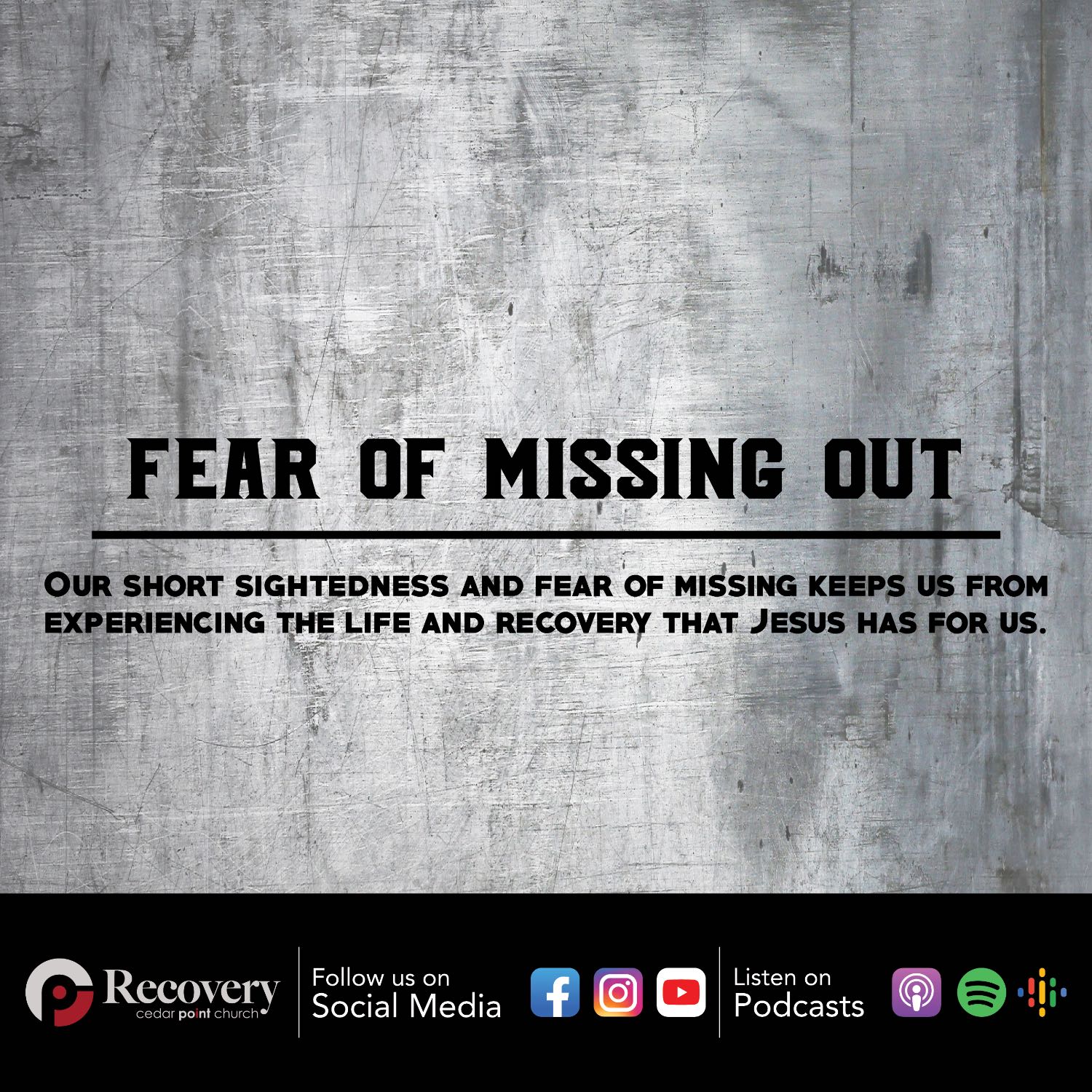 If we could visit our younger selves with a full comprehension of what Jesus came to do for us, wouldn't we choose him sooner? If we new then the kind of life he had prepared for us, would we have waited? It’s our short sightedness and fear of missing out that keeps us from experiencing the life and recovery that Jesus has intended for us. Join us tonight as we examine what our fear keeps us from.