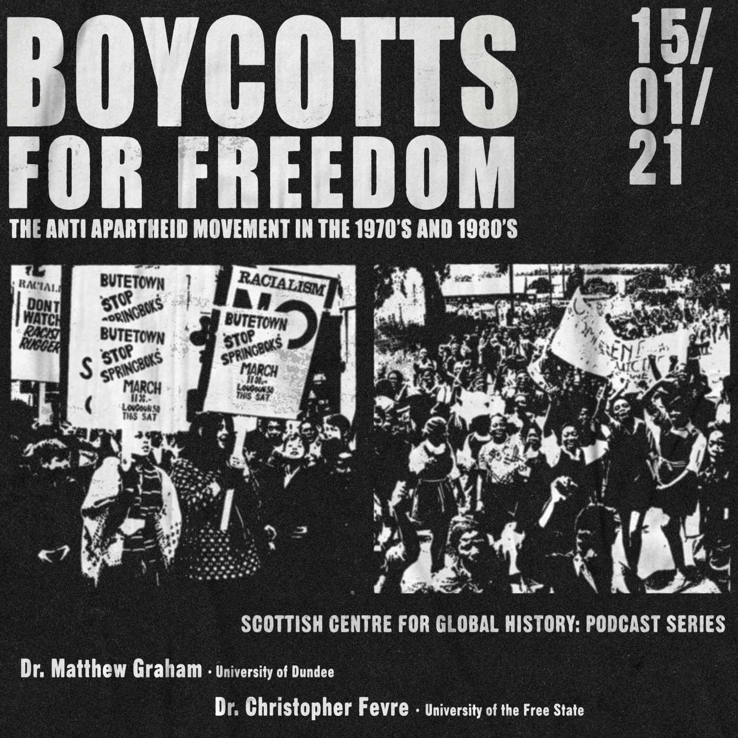 In the second episode of our four-part series on the British Anti-Apartheid movement (AAM) in Britain, SCGH editor Paul Feeney discusses the growth of the anti-Apartheid movement throughout the 1970s and 1980s with scholars of South Africa Dr. Matthew Graham (@SAhistoryMatt) and Dr. Christopher Fevre (@ChrisFevre).