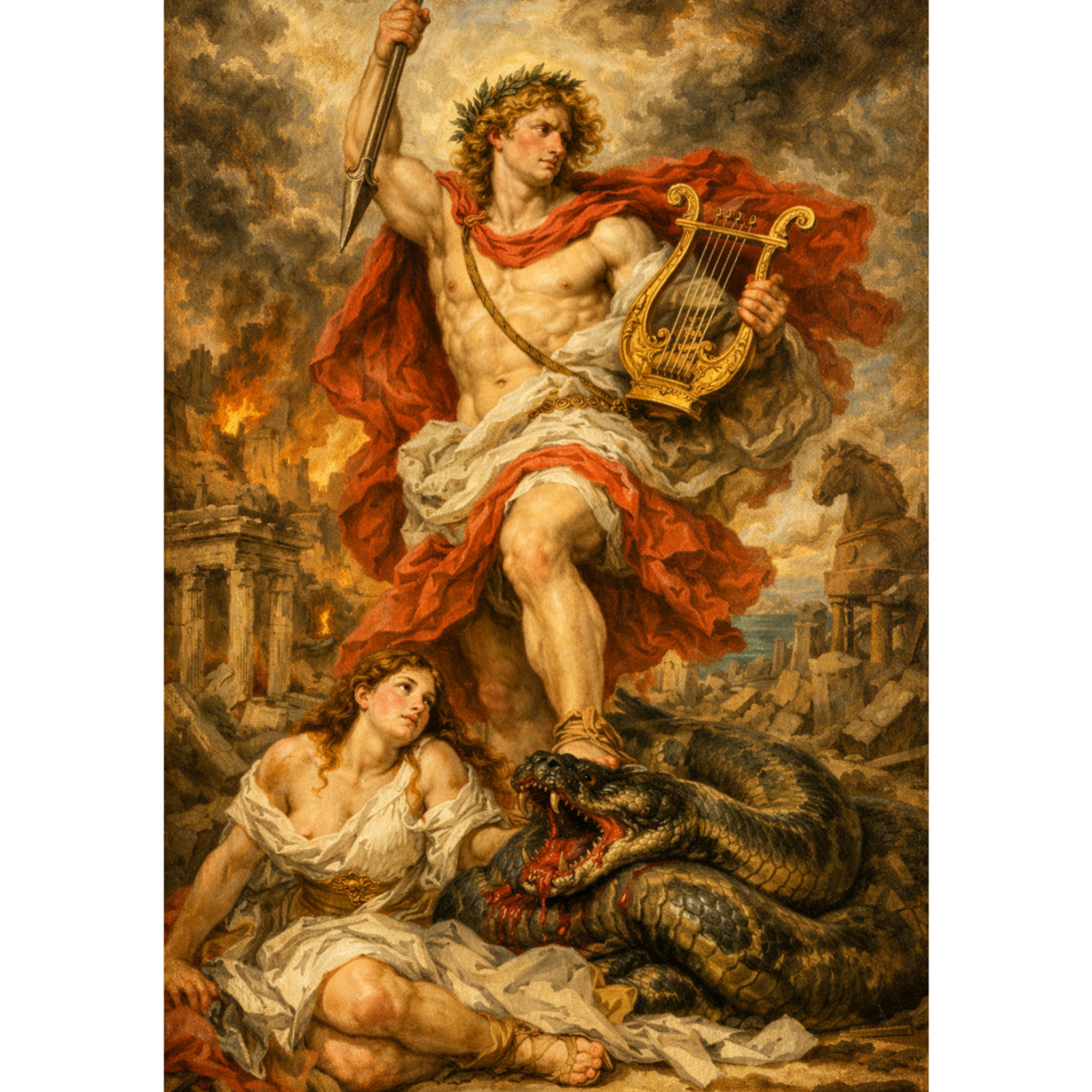Episode art: Apollo stepping on the python with Cassandra at his feet with the walls of Troy behind them - ChapGPT