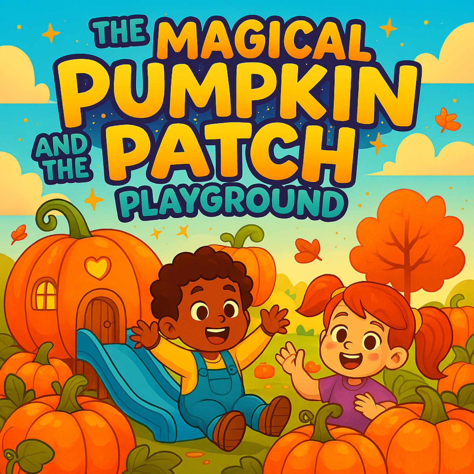 "The Pumpkin Patch Playground Magic," detailing a fantastic event where Farmer Jolly’s ordinary pumpkin patch transforms into an extraordinary playground with structures made entirely of pumpkins. Children and various animals enjoy the unique pumpkin slides, tunnels, and trampolines, highlighting a theme of joyful interaction and play.