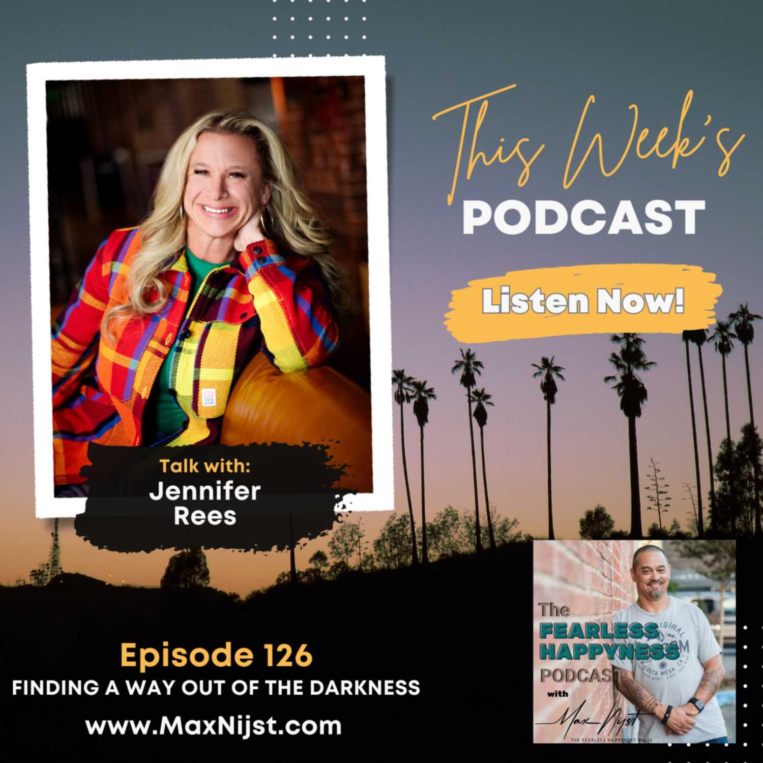 A wife, mother, and a successful serial entrepreneur, Jennifer Rees, known to her clients as Coach Jenn, has been coaching, mentoring, and training clients for over 20 years. Deeply rooted in her faith, family and living a life of love & service, Jennifer works side by side with her husband in multiple businesses in various industries and has a strong passion for mentoring teens, coaching women and healing marriages and families. Now stepping into her own as a motivational speaker and healing coach, Jennifer has recently co-founded Grace & Chaos, a business consulting firm that specializes in emotional and operational optimization, with her best friend and business partner. No stranger to trails, challenges, and darkness herself, Jennifer lives for leading people out of the darkness to create the live they desire for themselves and those they love. There isn’t a darkness she can’t shine a light on, or a pain-cave she won’t walk into to accomplish her mission. Listen in as Jennifer and I discuss her own walks in darkness, what shining lights came into her life and changed her whole world and how her mission and passion for helping others has led her to a life of FEARLESS HAPPYNESS!