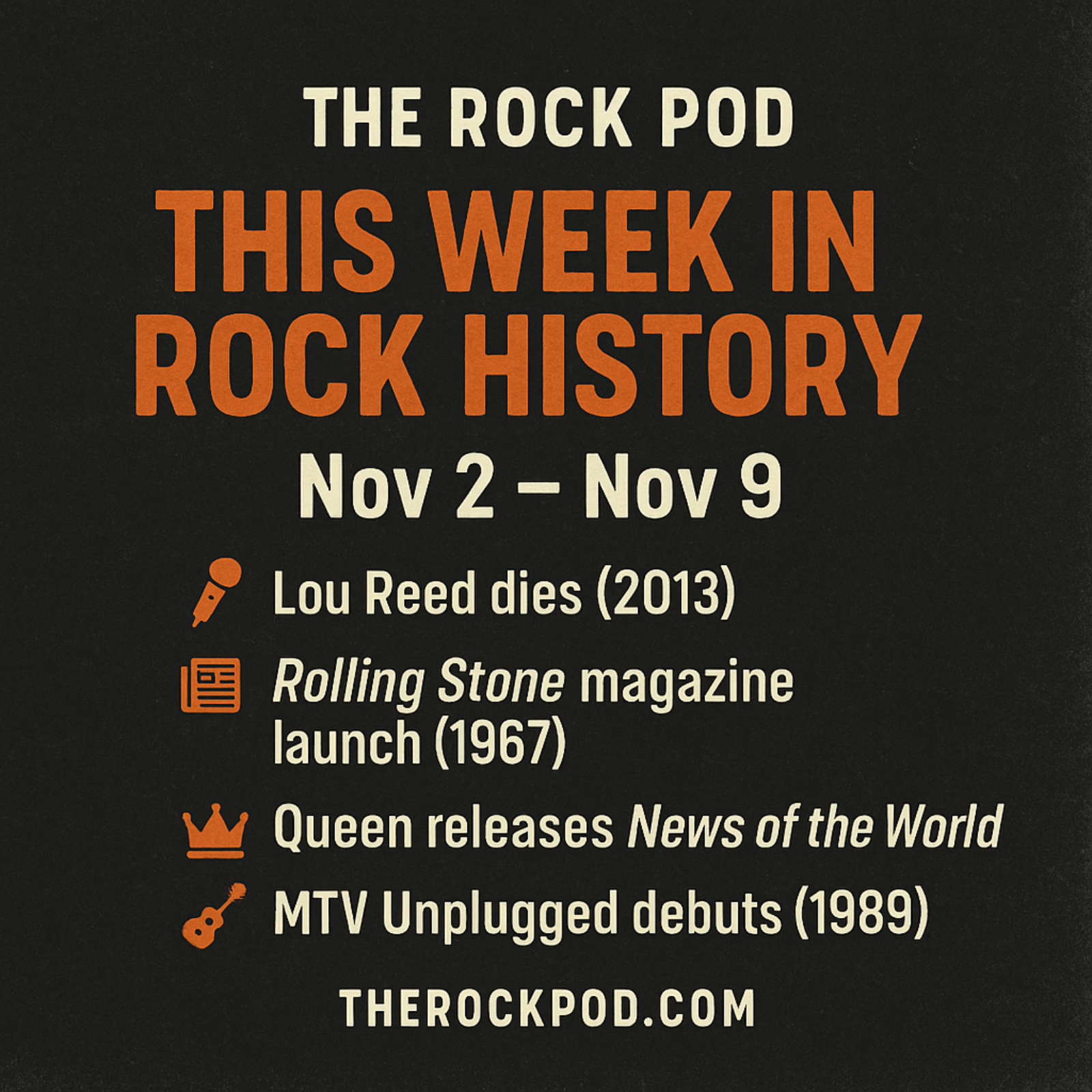 #TheRockPod #ThisWeekInRock #RockHistory #ClassicRock #Queen #FreddieMercury #LouReed #RollingStone #JohnLennon #MTVUnplugged #RockLegends #RockPodcast #VinylVibes #TurnItUp