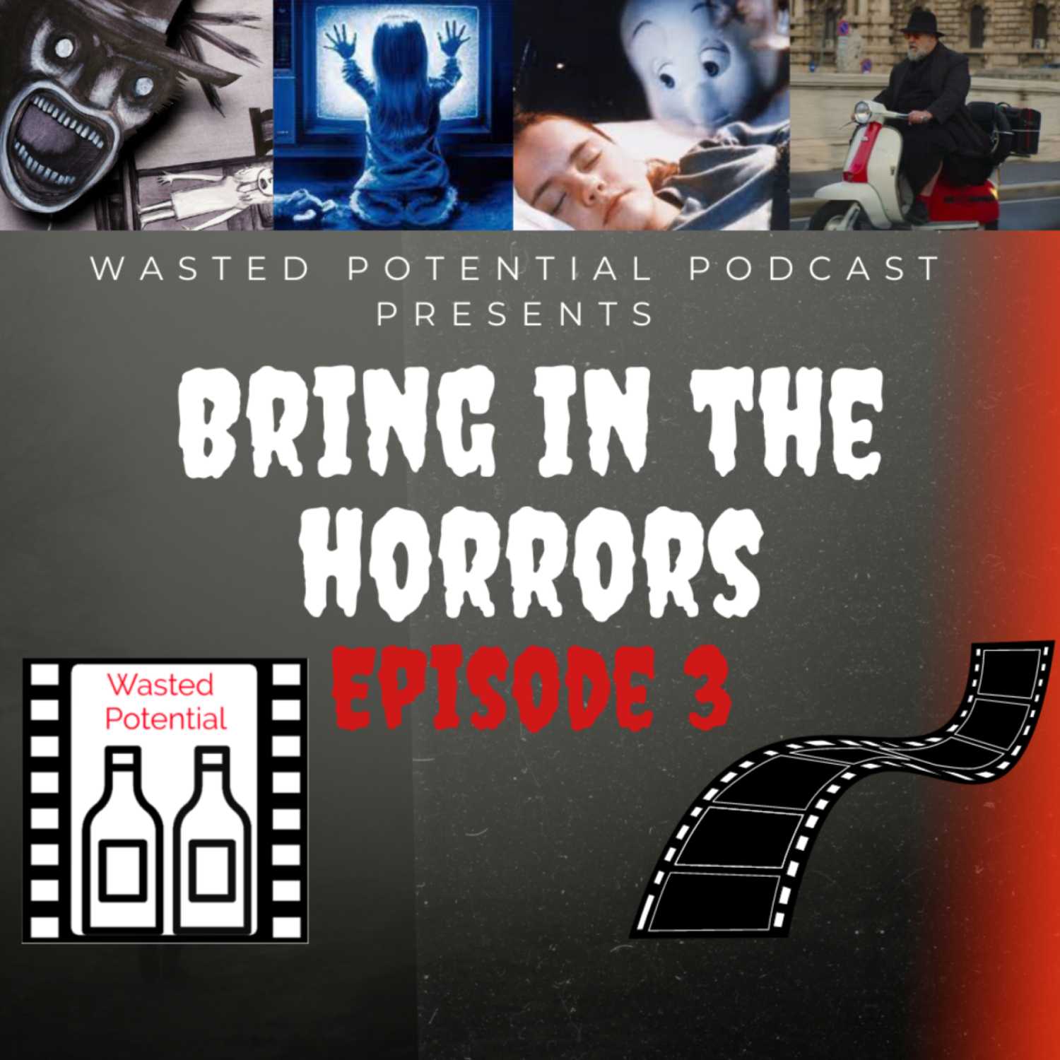 This episode features excerpts from: the Exorcist, Scream, the Thing, the Witch, Tommy Boy, the Babadook, Terminator 2, Poltergeist, Scary Movie 2, and The Pope's Exorcist.