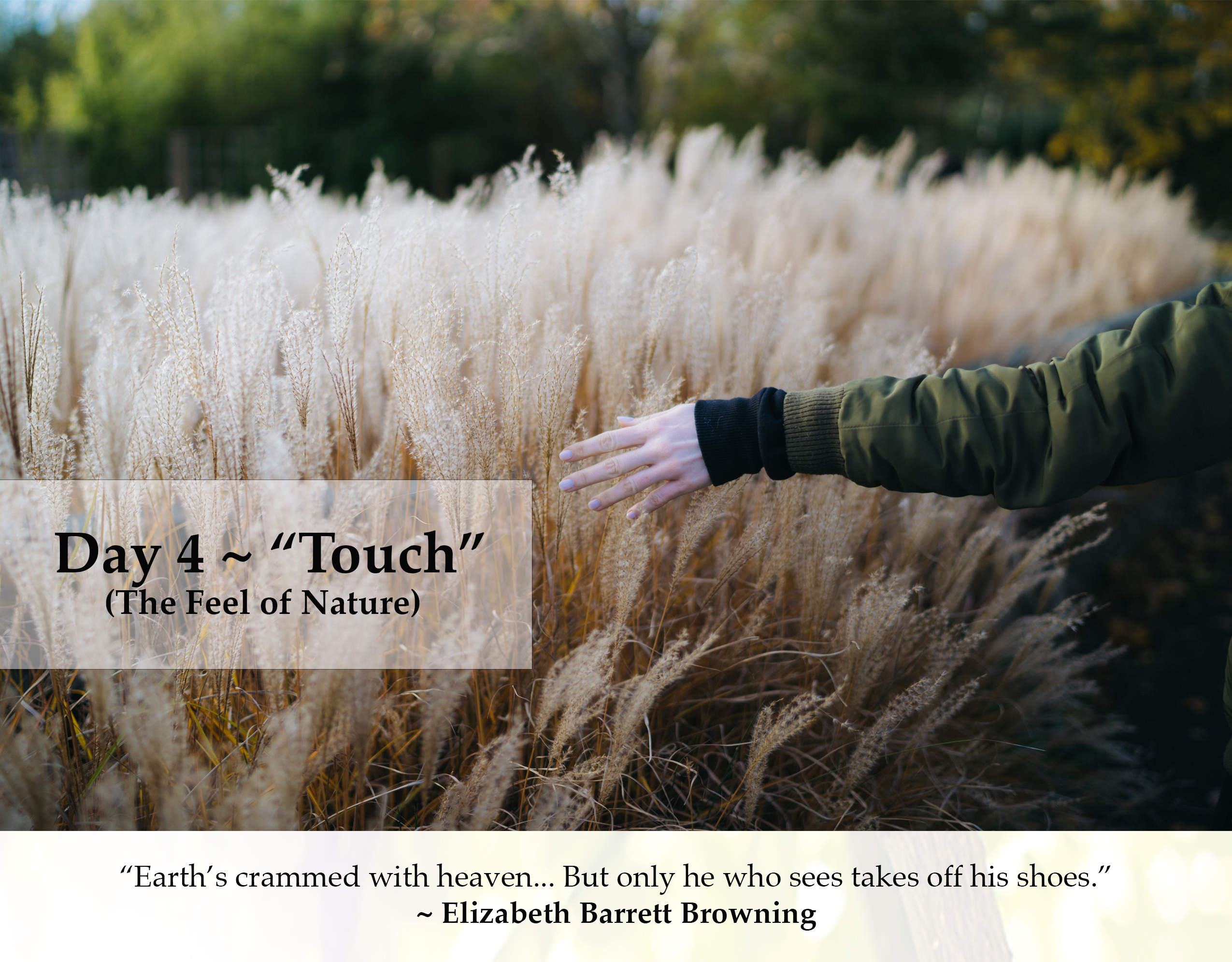 ☐ MEDITATION: Day 4 – “Learning to Be In ‘Touch’ With Your World” (You can listen to this active meditation on iTunes or here at Mountain Zen.)