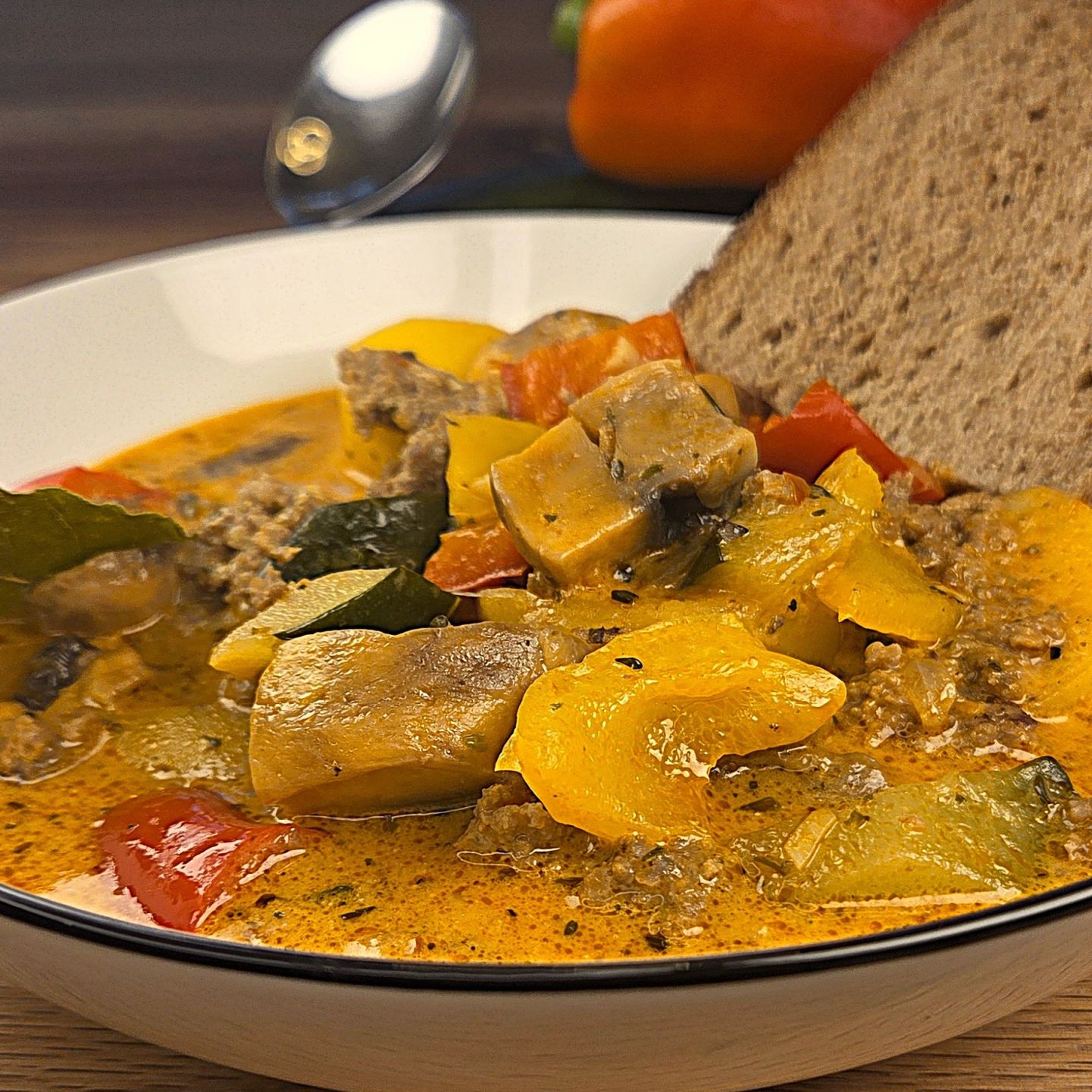 Kulinarisch gibt es einen cremigen, würzigen Bauerntopf mit Hackfleisch, viel Gemüse, Kartoffeln, Thymian und – ganz entscheidend – vier Lorbeerblättern. Kein Küchentalisman, kein Aberglaube, sondern Struktur und Tiefe.