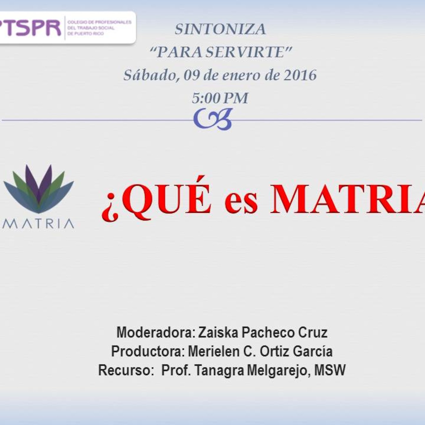 El Sábado 09 de enero de 2016, se estuvo discutiendo el tema Proyecto MATRIA, una organización sin fines de lucro fundada en el año 2004 para dar un nuevo enfoque hacia el grave problema de violencia de género y la agresión sexual en Puerto Rico. Para hablarnos sobre la misión, la visión y todo lo relacionado con el Proyecto nos acompañó la Profesora Tanagra Melgarejo, MSW y manejadora de caso del Proyecto. Productora; Merielen C. Ortiz García. Moderadora: Zaiska Pacheco Cruz.