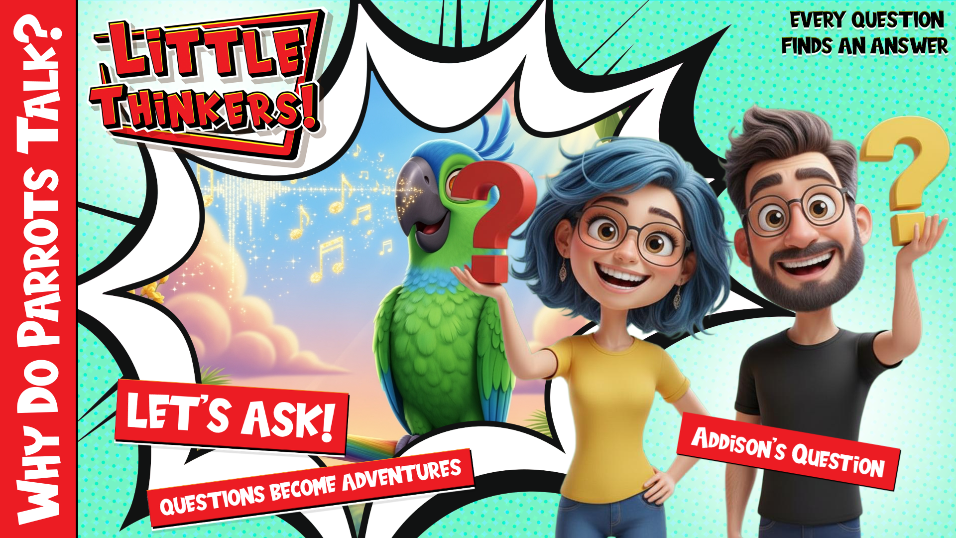 Ben and Pia answer Addison's brilliant question about why parrots can talk when other birds cannot! Join them as they explore the magical world of parrot communication and discover how these feathered friends have special brain recording studios that help them learn human words!