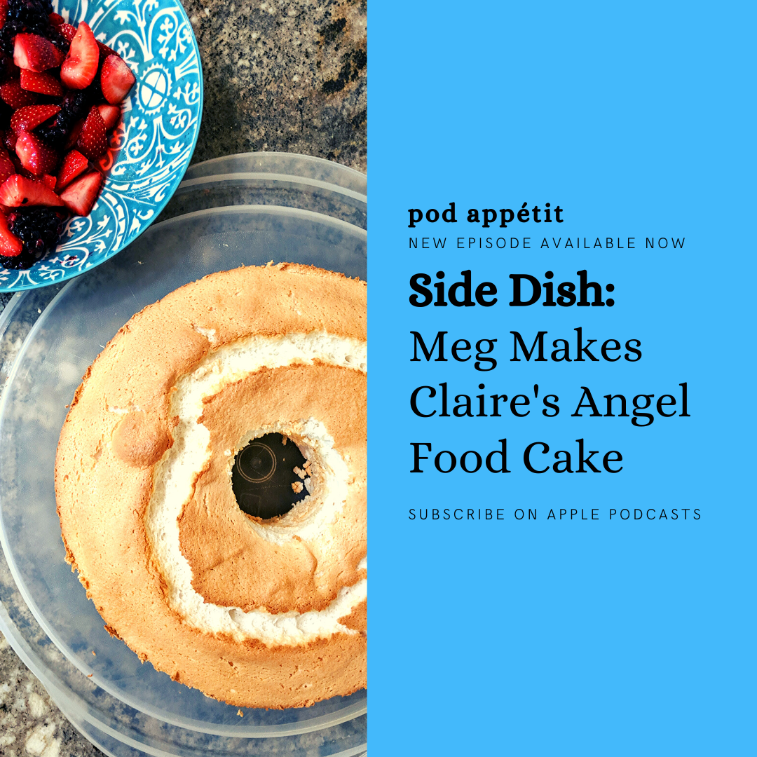 In this episode, Meg is joined by a very special guest: her mom! Mary, hobbyist recipe developer extraordinaire, lends Meg invaluable baking advice (and a tube pan) in the kitchen. Later, Amanda chimes in on what makes this cake as angelic as Claire herself. Listen for more.