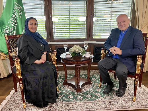 Hennes eksellense, fru Amal Yahya Almoalimi - ambassadør fra Kongeriket Saudi-Arabia til Kongeriket Norge - tar imot Pastor Jan-Aage Torp ved Saudi-Arabias kongelige ambassade i Oslo til en hyggelig samtale.