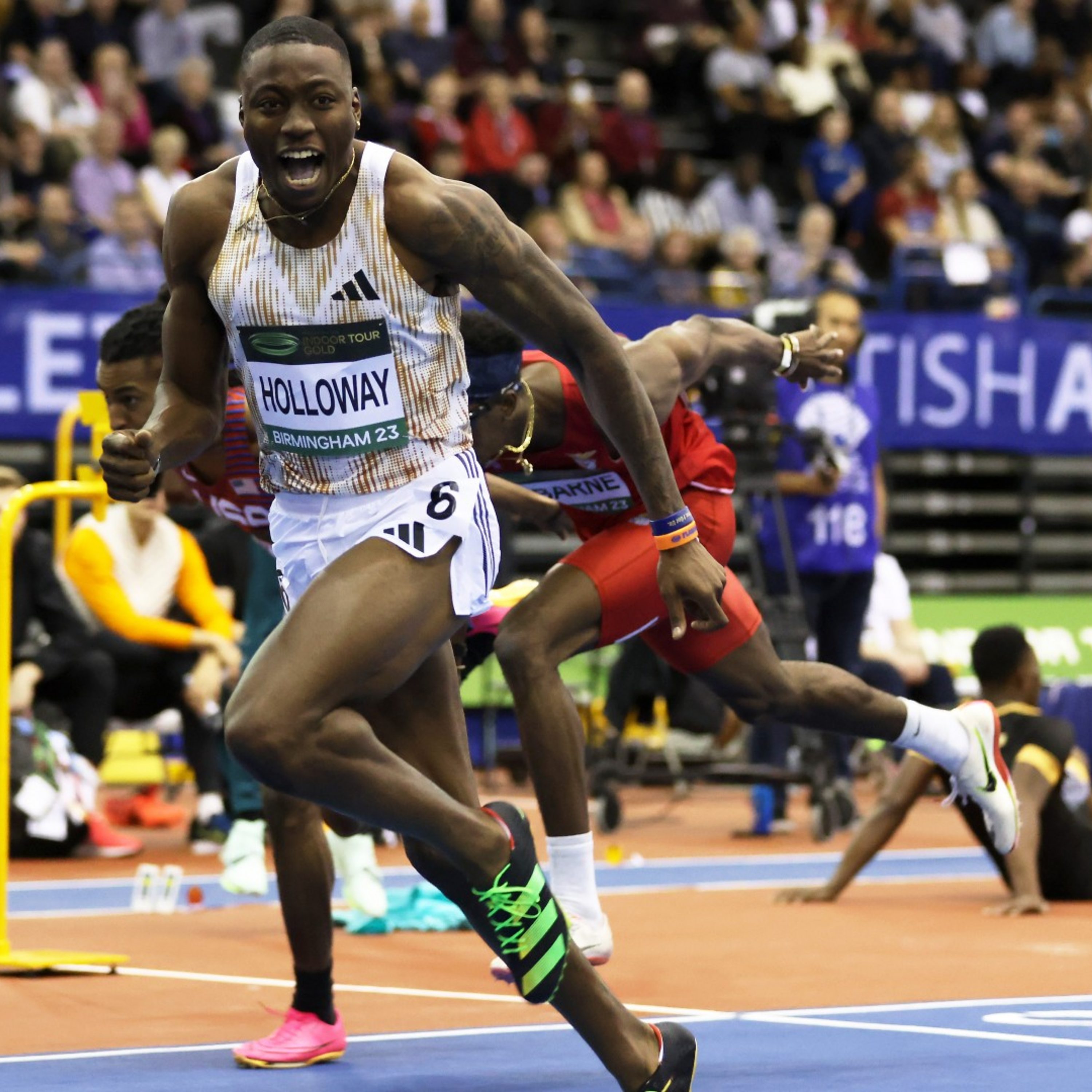 (Image: Grant Holloway of USA celebrates after winning the Men's 60m Hurdles during the World Athletics Indoor Tour - Birmingham at Utilita Arena Birmingham on February 25, 2023 in Birmingham, England. Photo by Stephen Pond - British Athletics/British Athletics via Getty Images)