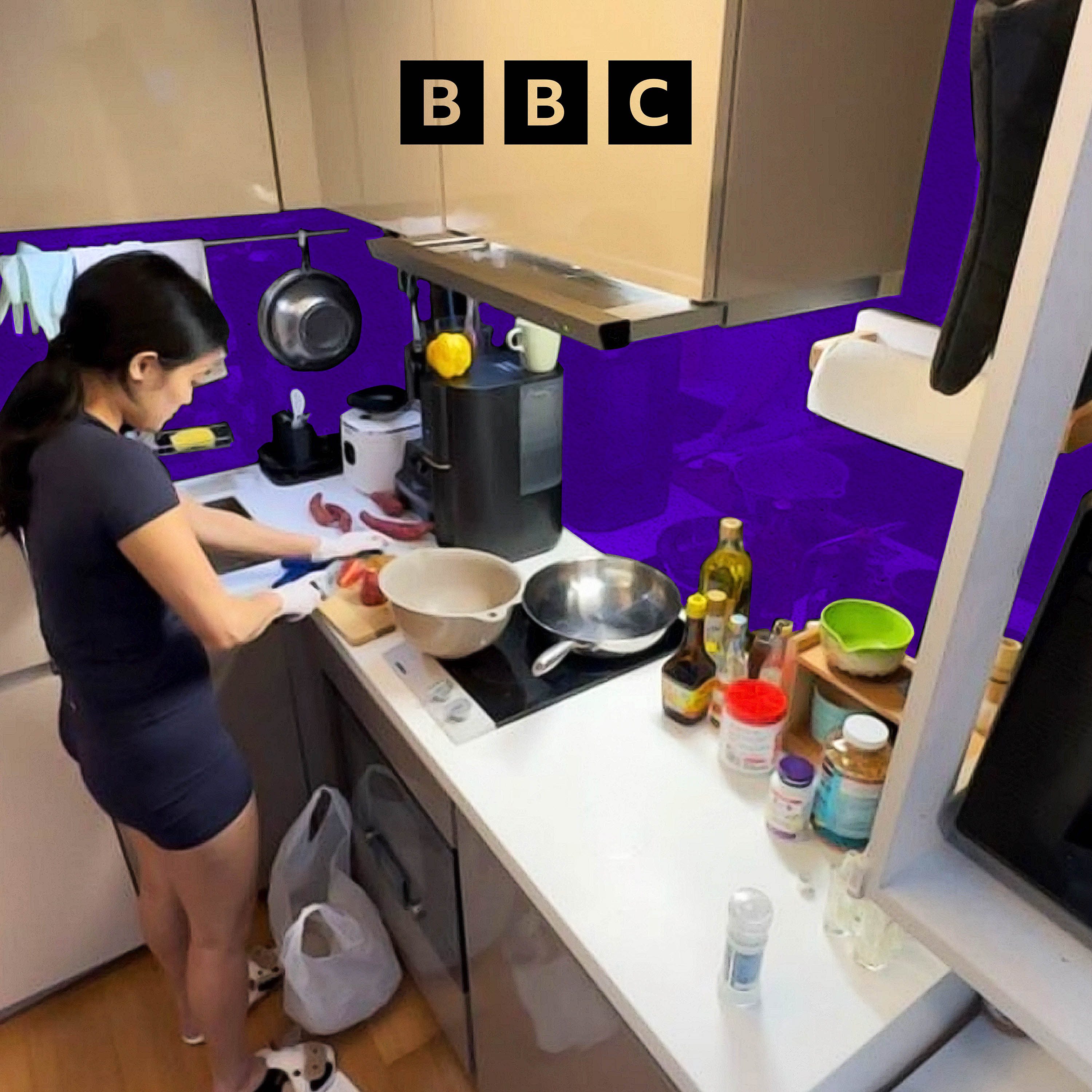 Image Description: Gina Lai is cooking in her tiny Hong Kong flat. (Credit Gina Lai/BBC)