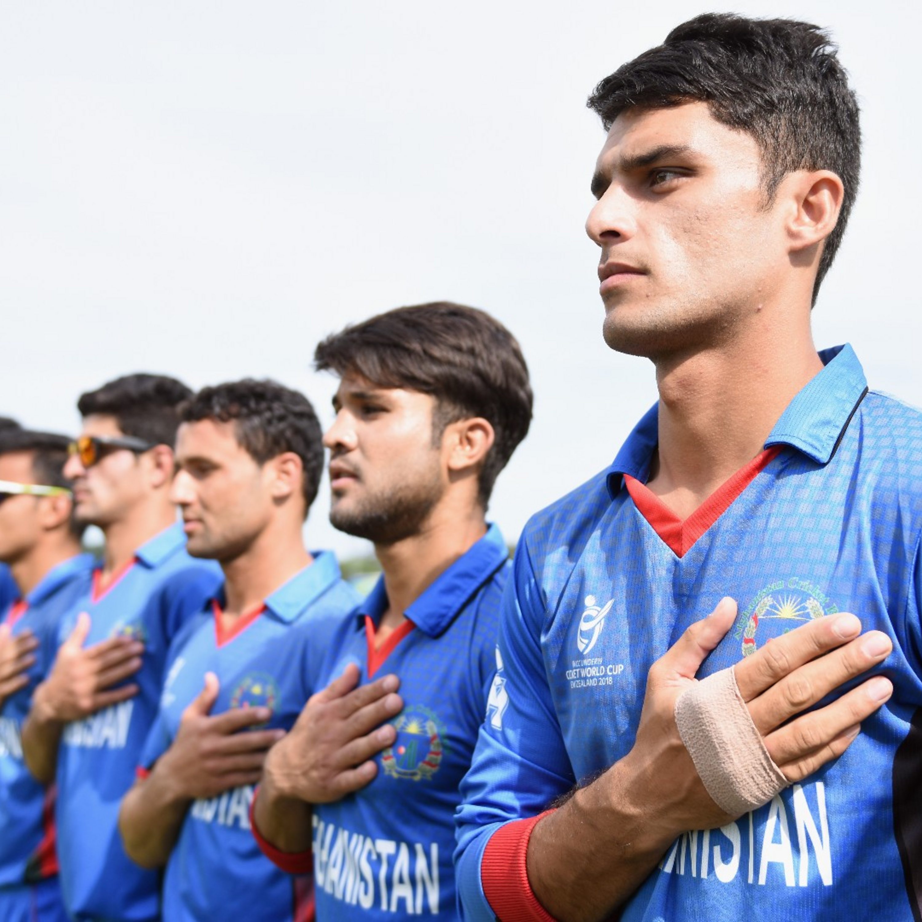 Photo: Captain Naveen Ul Haq of Afghanistan and his team mates line up for their national anthem prior to the ICC U19 Cricket World Cup match between New Zealand and Afghanistan at Hagley Oval on January 25, 2018 in Christchurch, New Zealand