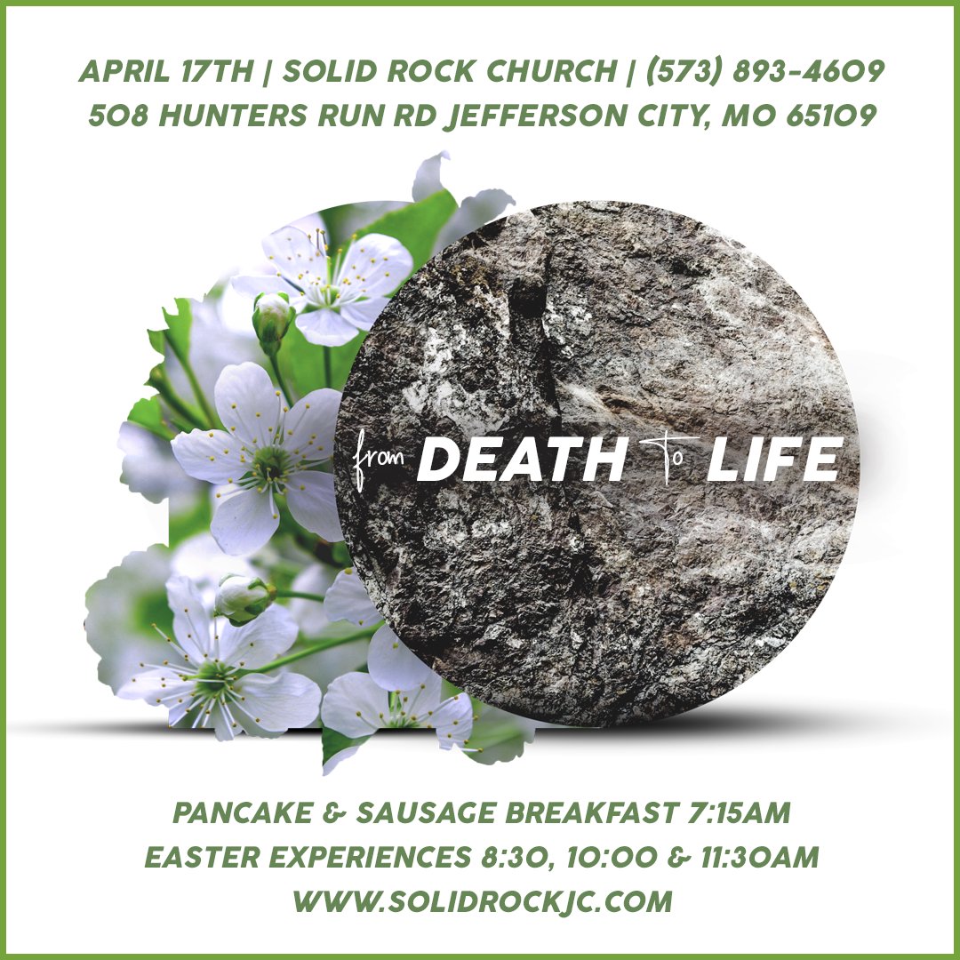 Join us this Sunday at 8:30, 10 or 11:30am as we celebrate our risen Savior! You don't want to miss this incredible time together! For more info, please call the church at (573) 893-4609 or email us at admin@solidrockjc.com