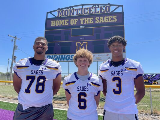 Joey Wright and Zach Piatt chat with Monticello football players Mason High, Ike Young and Carter Foran along with coach Cully Welter ahead of the 2024 high school football season.
