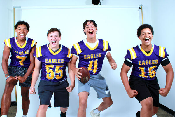 Rantoul football players DJ Davis, Emarion White and Andrew Owen — with coach Brett Trefren — chat with Joey Wright and Zach Piatt after the program's first victory in nearly six years.