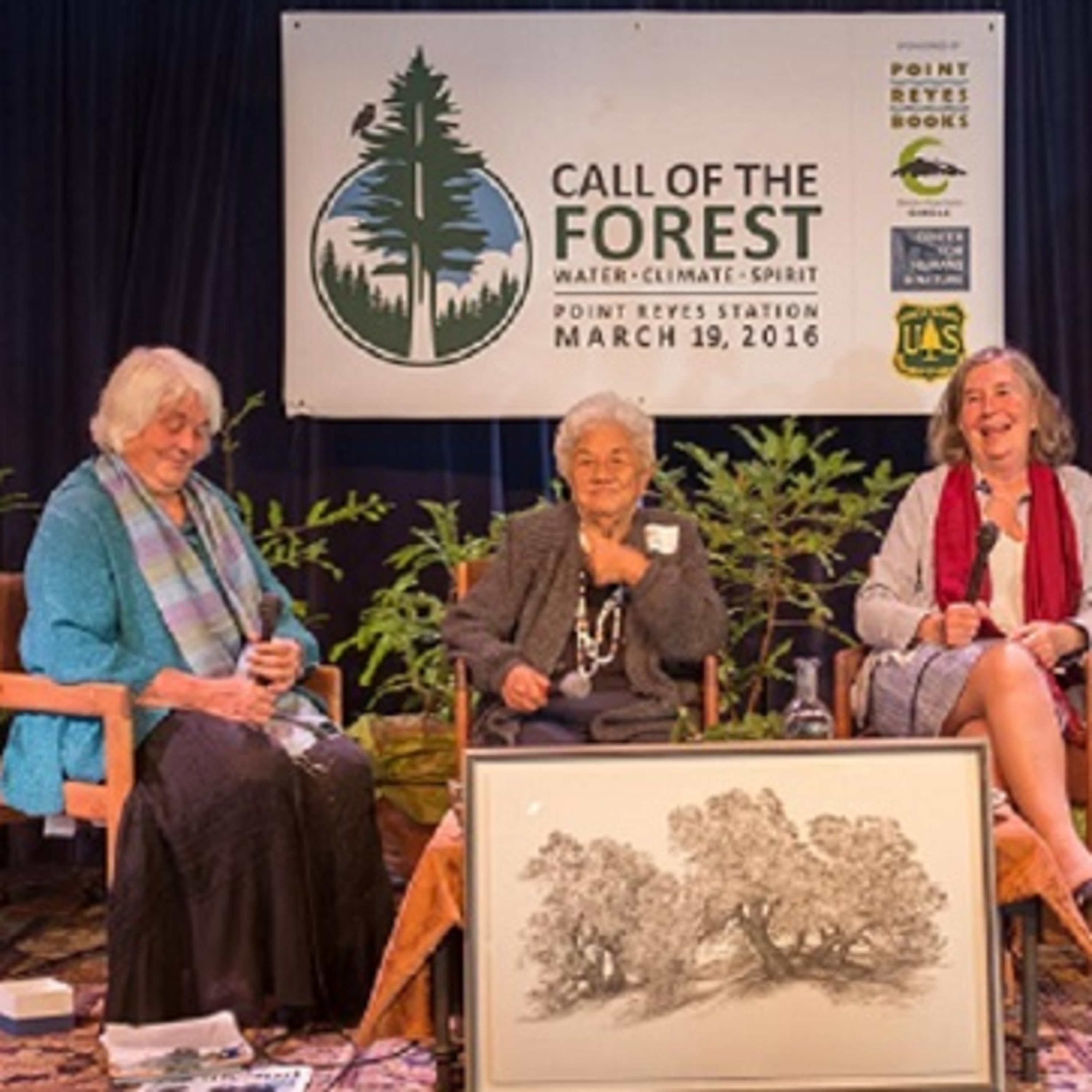 Call of the Forest Conference - Spirit Panel took place at the Dance Palace, Point Reyes Station on March 19, 2016, with Diana Beresford-Kroeger - author and botanist, Mary Evelyn Tucker - co-director of the Forum on Religion and Ecology at Yale., Joanne Campbell - Miwok Elder, and Wendy Johnson (moderator) - San Francisco Zen Center Buddhist teacher