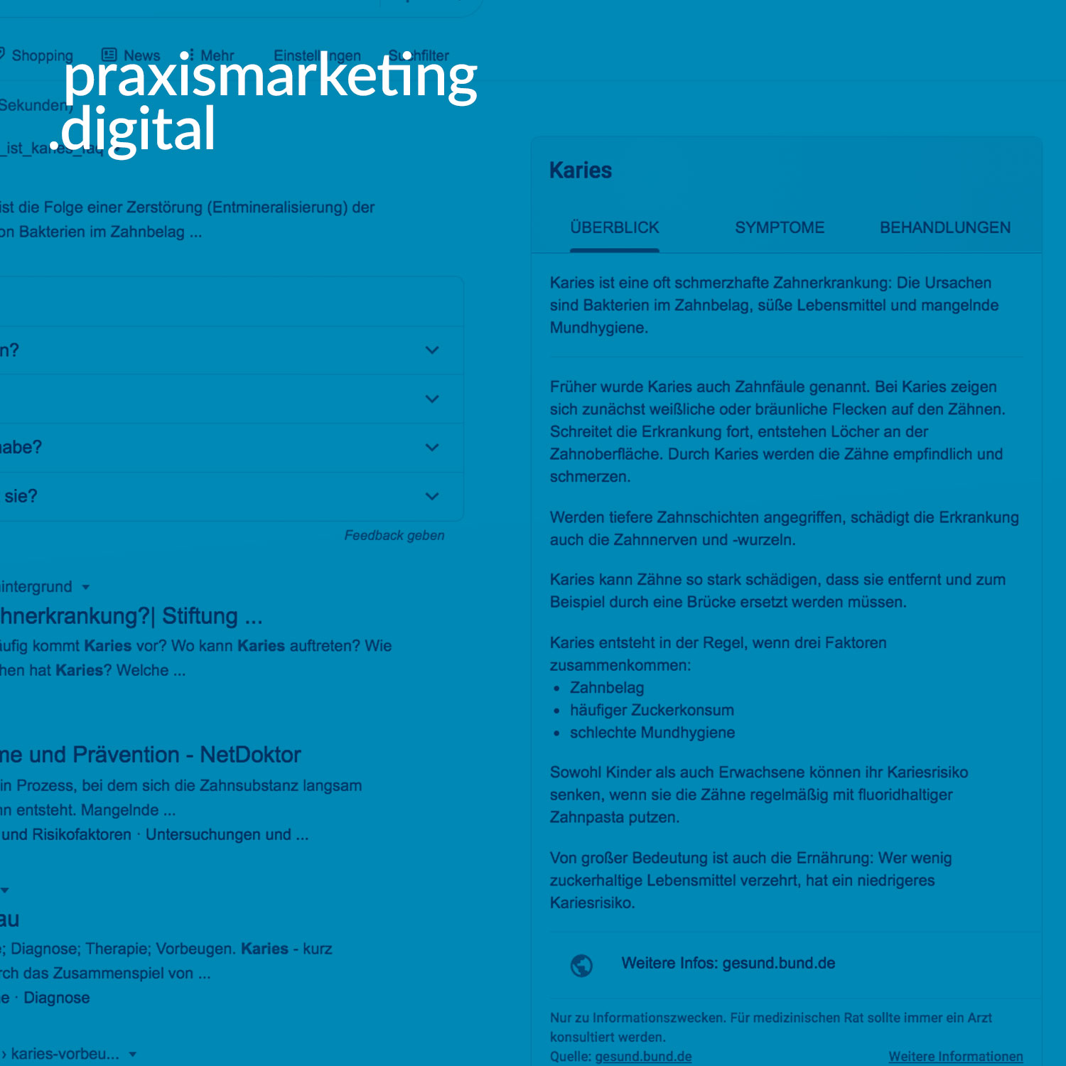 Wird Dr. Google nun zu Dr. Bund? Wer verlässliche Gesundheitsinformationen sucht, der wird diese laut dem des Bundesministerium für Gesundheit (BMG) und Google ab sofort leichter finden. Wer z.B. nach Karies sucht, finden nun direkt und sehr prominent Ergebnisse vom Bund. Und das ist kein Zufall sondern so gewollt von dem Bundesministerium und Google.
