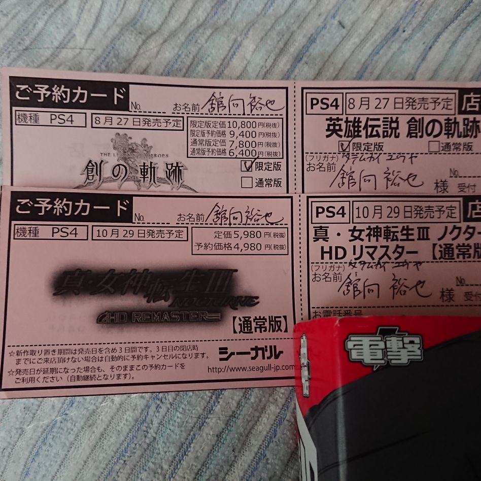 「英雄伝説 創の軌跡」と「真・女神転生III Nocrurne HD Remaster」を山形市内のゲームショップ「シーガル」で予約しました。