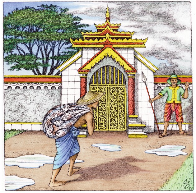 A fisherman shares his reward from the king with the gatekeeper. The gatekeeper is in for a surprise!