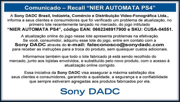 >Comunicado da Sony DADC sobre o recall de NieR Automata