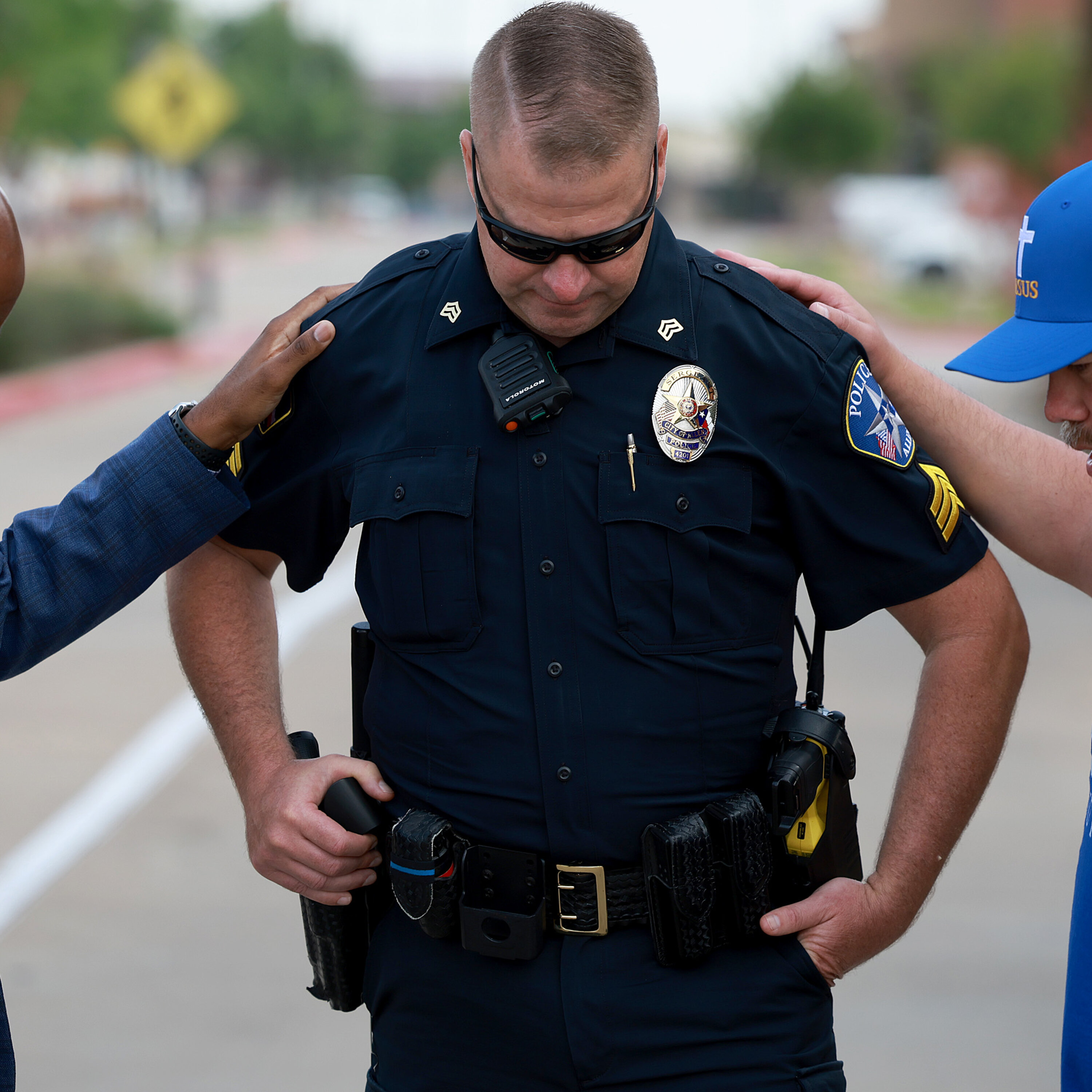 Photo: Richard Scotman (L) and Gabriel Riveros pray with City of Allen police officer Sgt. Ty Latham at an entrance to the Allen Premium Outlets mall after the mass shooting occurred on May 8, 2023, in Allen, Texas. (Photo by Joe Raedle/Getty Images)
