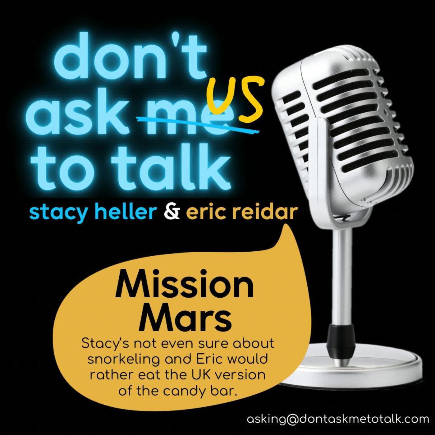 Eric found his best descriptor yet for DAMTT; we’re conversational off-roaders! Where else do the stories go from snorkeling in Tahiti (and reenacting Kim Kardashian’s iconic diamond earring debacle) to Taking Your Parents to Lunch with everything from Soul Coughing, Korean Tapas, a special font for sarcasm (Comic Sans?), corn, handbags, Yom Kippur, African Penguin Awareness, M&M’s, and Columbus in between. Stacy and Eric also talk about Mars, the candy bar AND the planet. Follow DAMTT on Facebook and Instagram @dontaskmetotalk. Email us at asking@dontaskmetotalk.com Next time: Chef, Driver, or Housekeeper?
