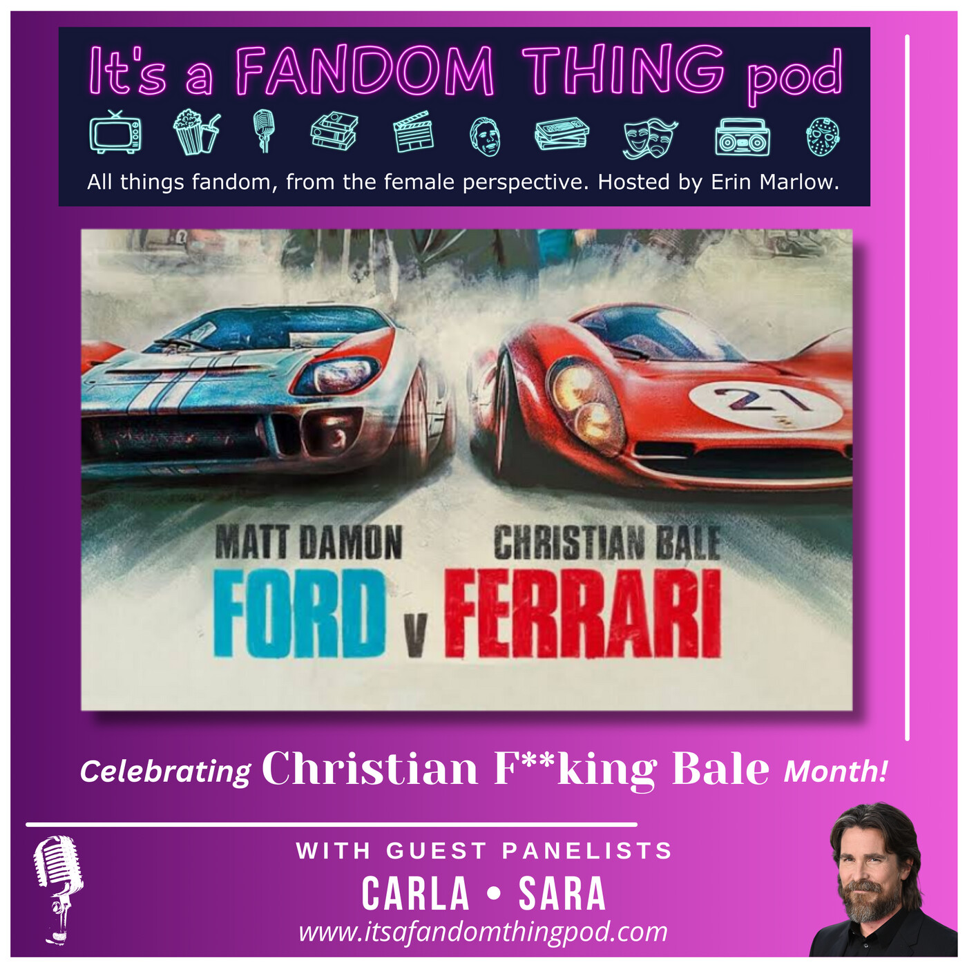 We are wrapping up our annual Christian F**king Bale Month celebration with a look at the film, Ford v Ferrari. Carla from Ok, Real Quick, and Sara join me to discuss Bale's performances, the relationship between Ken Miles and Carroll Shelby, the other characters, and what we thought of the ending.