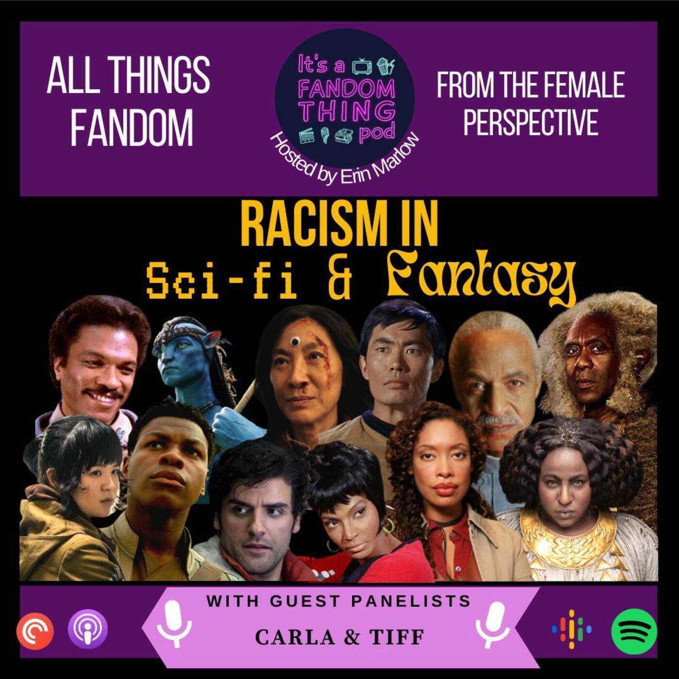 In this episode, Carla, from Bed, Wed or Behead podcast, and Tiff join Erin to discuss racism in Sci-Fi and Fantasy. They talk about harmful stereotypes that persist today, how important it is to not only have representation, but to have good representation, mention how gross and dehumanizing it is to describe people who are not white as being the color of food, and much, much more! We mention everything from Star Trek to The Lord of the Rings. Trigger warnings: Racism, misogynoir, sexism, and abuse.