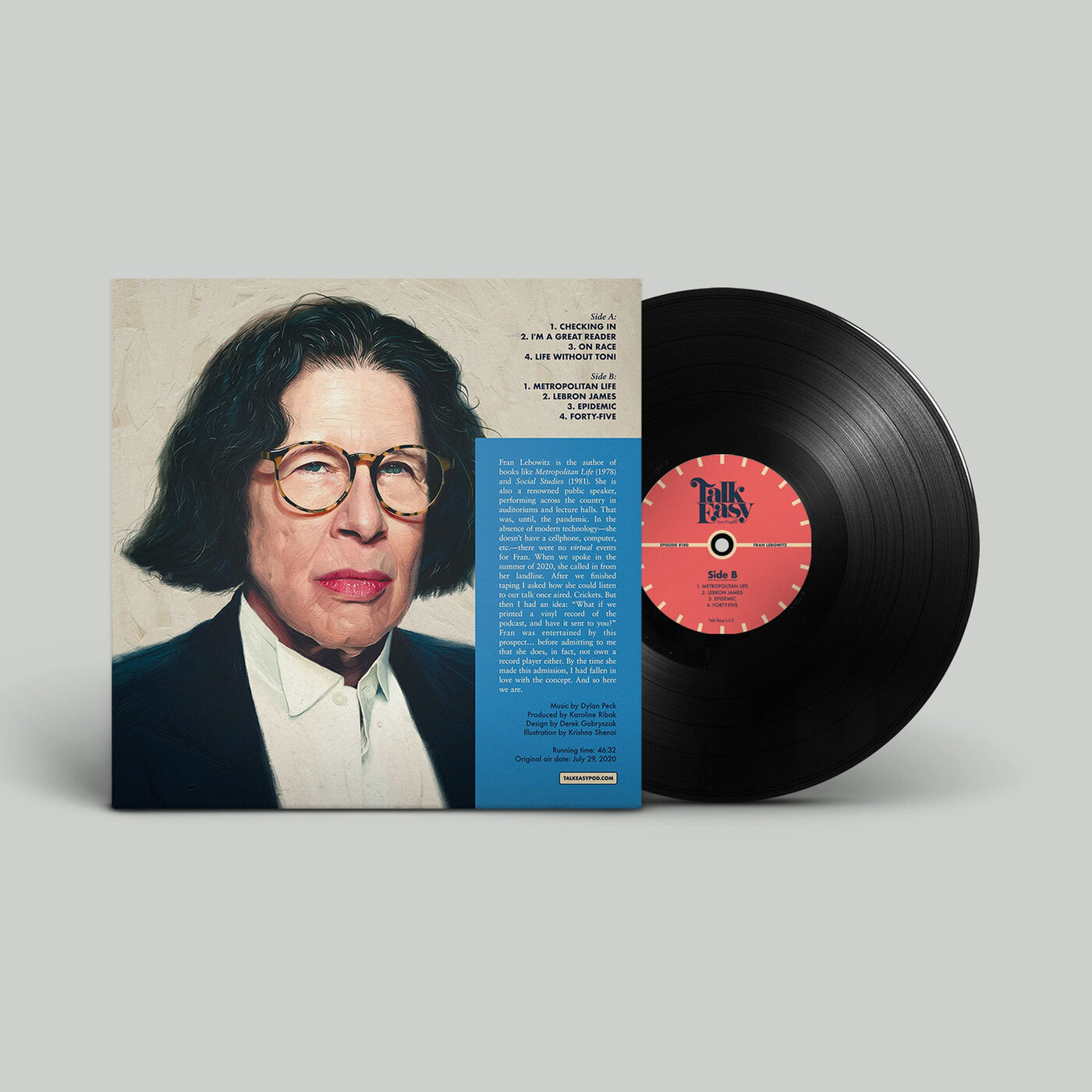 Our conversation with Fran Lebowitz is now available on vinyl! Visit www.talkeasypod.com/shop for more info. Fran is the author of books like Metropolitan Life (1978) and Social Studies (1981). She is also a renowned public speaker, performing across the country in auditoriums and lecture halls. That was, until, the pandemic. In the absence of modern technology—she doesn’t have a cellphone, computer, etc.—there were no virtual events for Fran.When we spoke in the summer of 2020, she called in from her landline. After we finished taping I asked how she could listen to our talk once aired. Crickets. But then I had an idea: “What if we printed a vinyl record of the podcast, and have it sent to you?” Fran was entertained by this prospect… before admitting to me that she does, in fact, not own a record player either. By the time she made this admission, I had fallen in love with the concept. And so here we are.