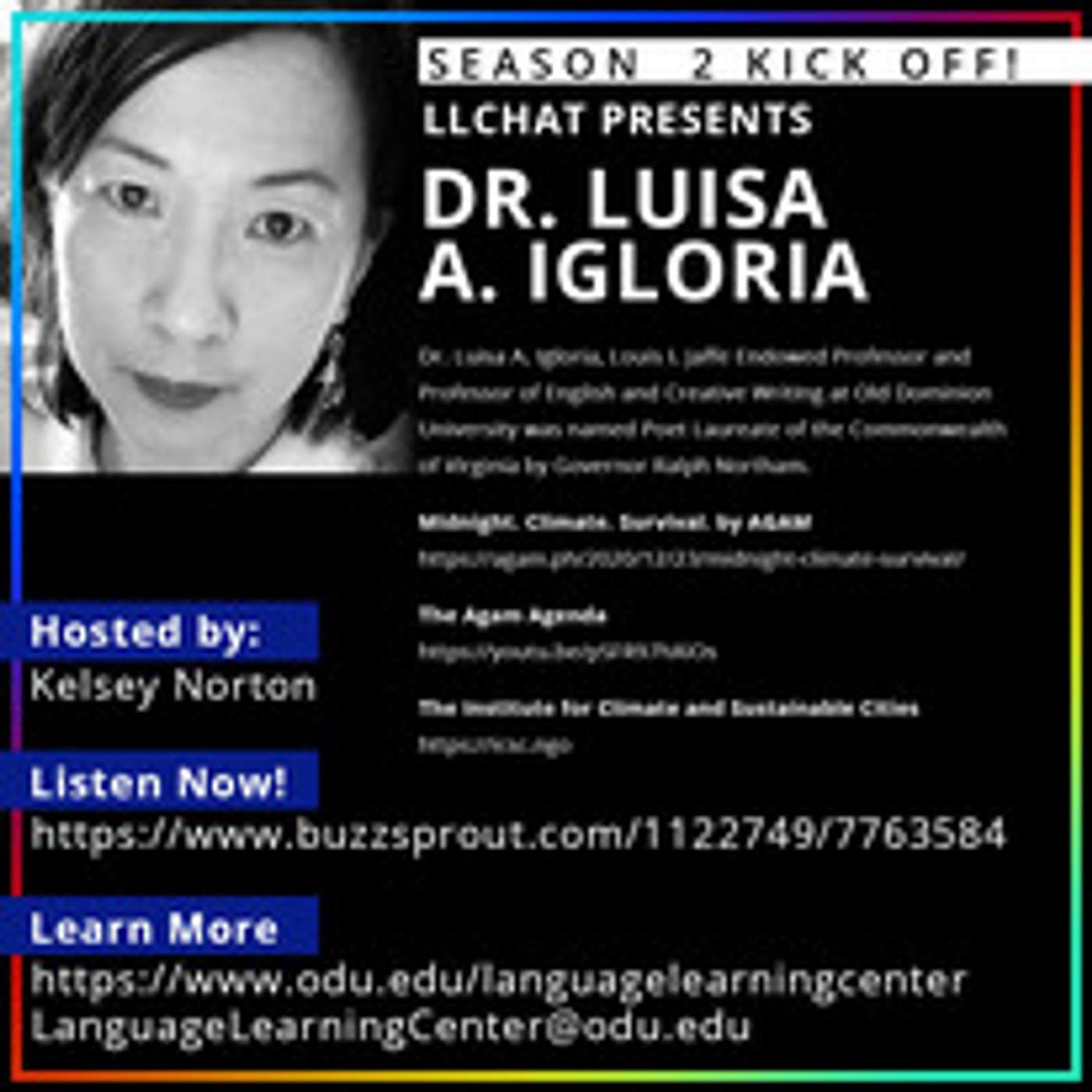 LLChat is thrilled to continue our second season with a fascinating interview with Dr. Luisa A. Igloria, Professor of English and Creative Writing at Old Dominion University. Dr. Igloria was named Poet Laureate of Virginia and is the Louis I. Jaffe Endowed Professor. In this episode, Dr. Igloria speaks of her creative influences, her experiences growing up in the Philippines, multilingualism, and even gives us a little lesson on etymology.