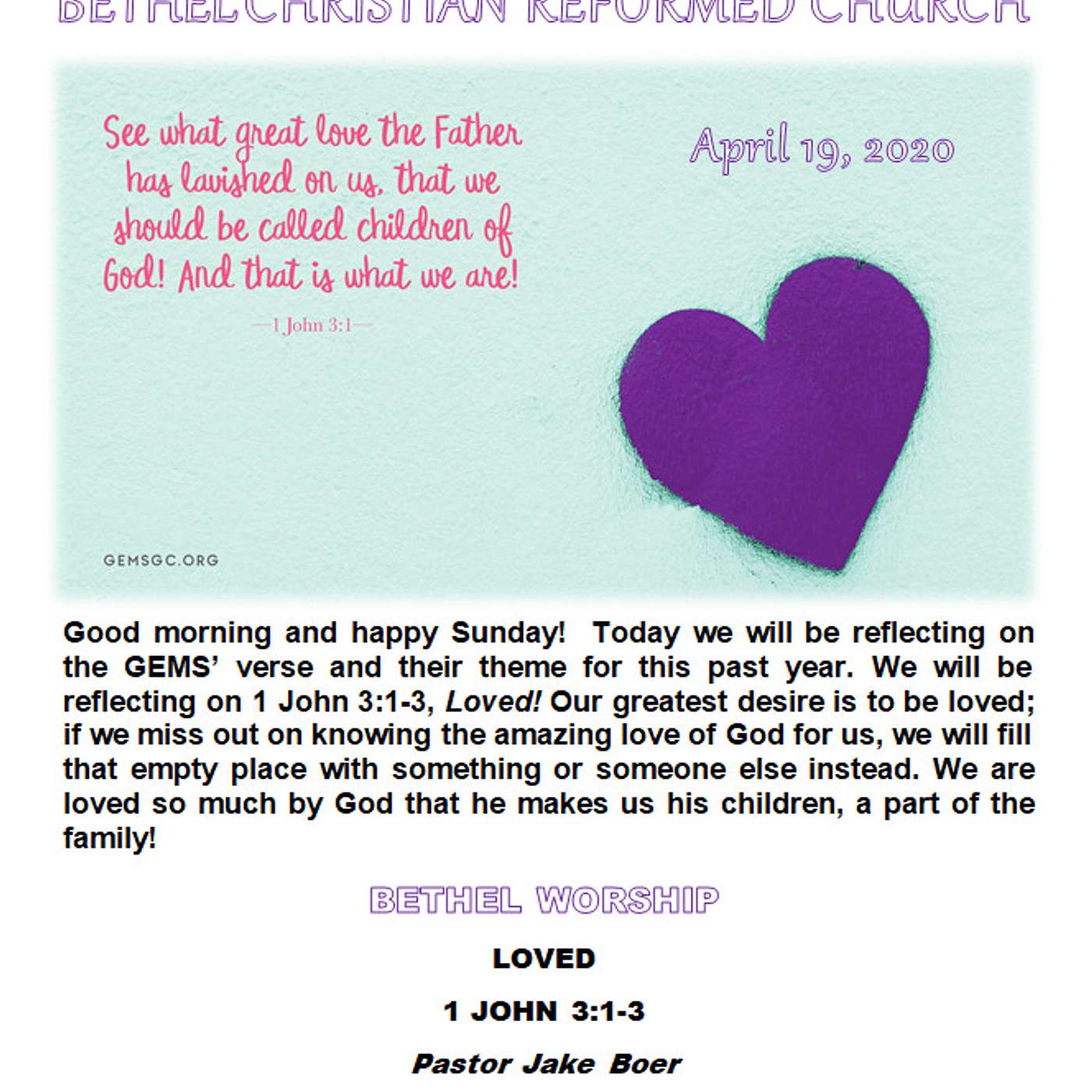 Today we will be reflecting on the GEMS’ and their theme for this past year. We will be reflecting on 1 John 3:1-3, Loved! Our greatest desire is to be loved; if we miss out on knowing the amazing love of God for us, we will fill that empty place with something or someone else instead. We are loved so much by God that he makes us his children, a part of the family!