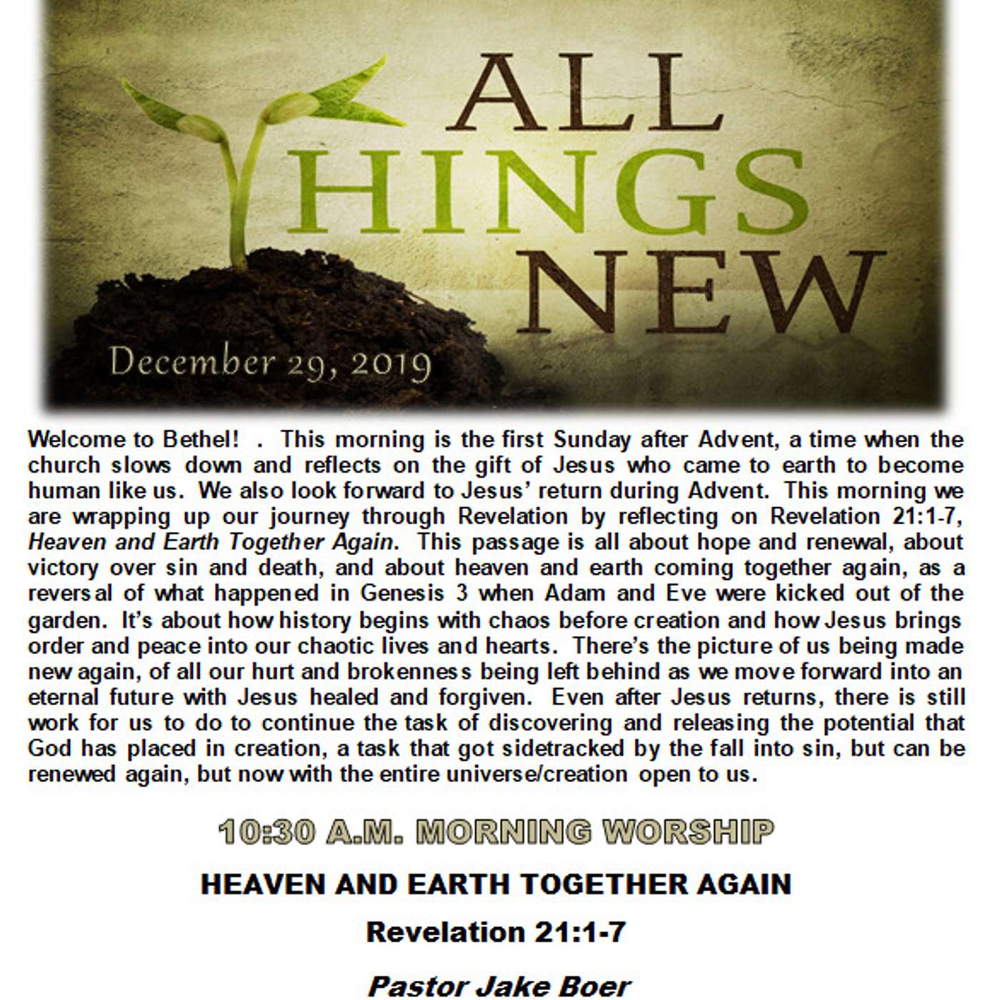 This morning is the first Sunday after Advent, a time when the church slows down and reflects on the gift of Jesus who came to earth to become human like us. We also look forward to Jesus’ return during Advent. This morning we are wrapping up our journey through Revelation by reflecting on Revelation 21:1-7, Heaven and Earth Together Again. This passage is all about hope and renewal, about victory over sin and death, and about heaven and earth coming together again, as a reversal of what happened in Genesis 3 when Adam and Eve were kicked out of the garden. It’s about how history begins with chaos before creation and how Jesus brings order and peace into our chaotic lives and hearts. There’s the picture of us being made new again, of all our hurt and brokenness being left behind as we move forward into an eternal future with Jesus healed and forgiven. Even after Jesus returns, there is still work for us to do to continue the task of discovering and releasing the potential that God has placed in creation, a task that got sidetracked by the fall into sin, but can be renewed again, but now with the entire universe/creation open to us.