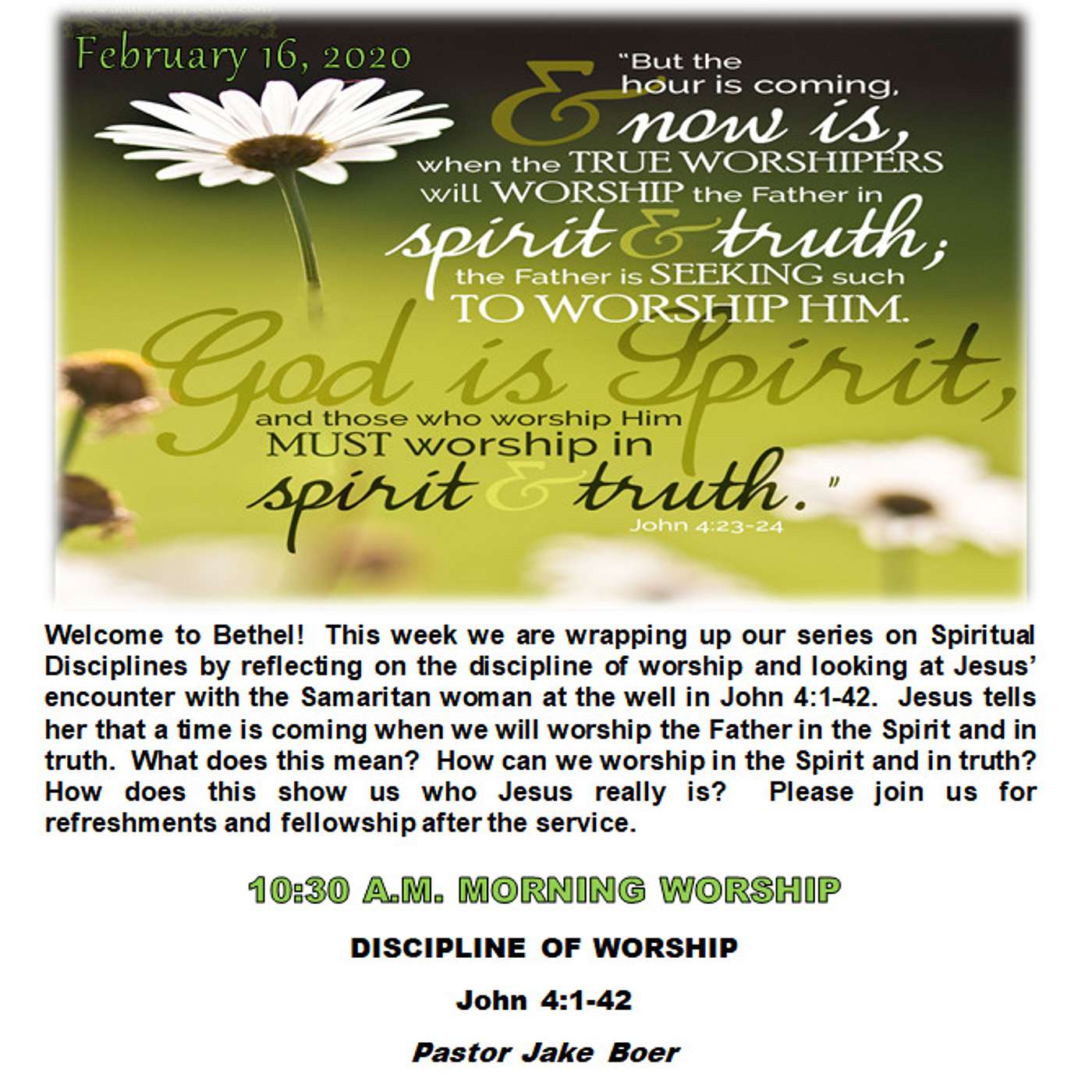 This week we are wrapping up our series on Spiritual Disciplines by reflecting on the discipline of worship and looking at Jesus’ encounter with the Samaritan woman at the well in John 4:1-42. Jesus tells her that a time is coming when we will worship the Father in the Spirit and in truth. What does this mean? How can we worship in the Spirit and in truth? How does this show us who Jesus really is?