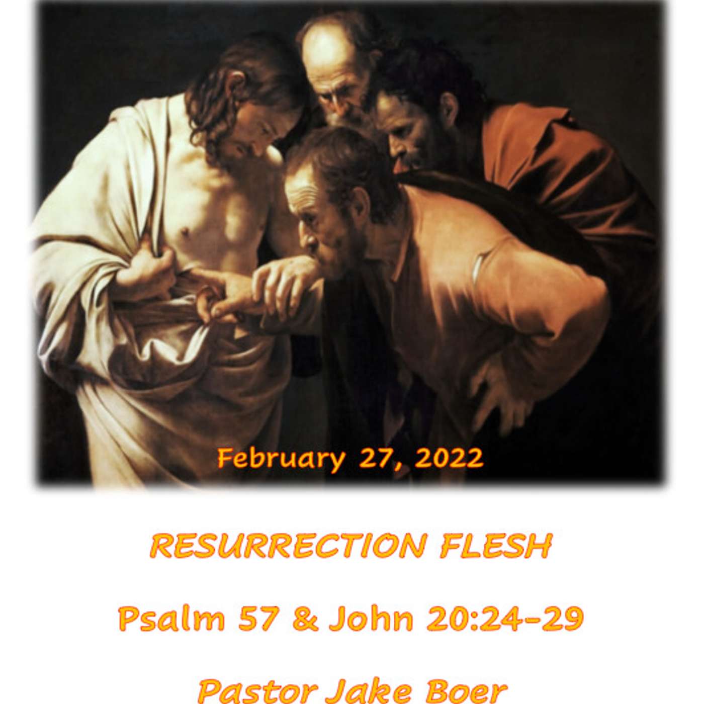 Todaywe have the privilege of celebrating in the Lord’s Supper and we will be wrapping up our series on the Apostle’s Creed by reflecting on Psalm 57 and John 20:24-29, Resurrection Flesh. The creed teaches us under the section the work of the Holy Spirit that we believe in the resurrection of the body and life everlasting. The psalmist takes refuge in God, trusting God to protect him and save him. Jesus comes to save us; he dies on the cross and comes back in his physical body to reassure his disciples that he is truly alive. Jesus comes to restore all creation. The physical creation, including our bodies is central to the redemption Jesus brings.