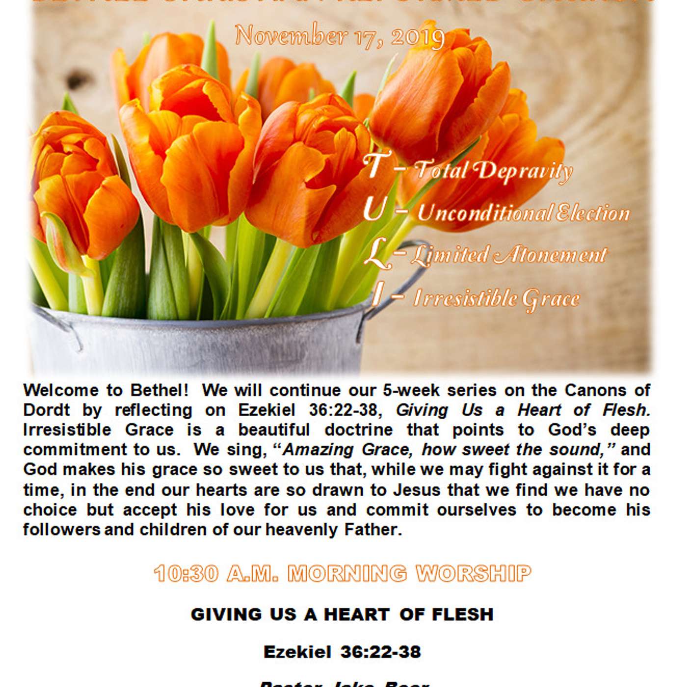 We will continue our 5-week series on the Canons of Dordt by reflecting on Ezekiel 36:22-38, Giving Us a Heart of Flesh. Irresistible Grace is a beautiful doctrine that points to God’s deep commitment to us. We sing, “Amazing Grace, how sweet the sound,” and God makes his grace so sweet to us that, while we may fight against it for a time, in the end our hearts are so drawn to Jesus that we find we have no choice but accept his love for us and commit ourselves to become his followers and children of our heavenly Father.