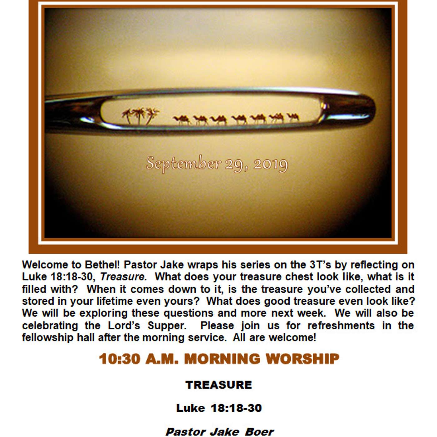 Today Pastor Jake wraps up to his series on the 3Ts by reflecting on Luke 18:18-30 Treasure. What does your treasure chest look like, what is it filled with? When it comes down to it, is the treasure you’ve collected and stored in your lifetime even yours? What does good treasure even look like? We will be exploring these questions and more. We will also be celebrating the Lord’s Supper. Please join us for refreshments in the fellowship hall after the morning service.
