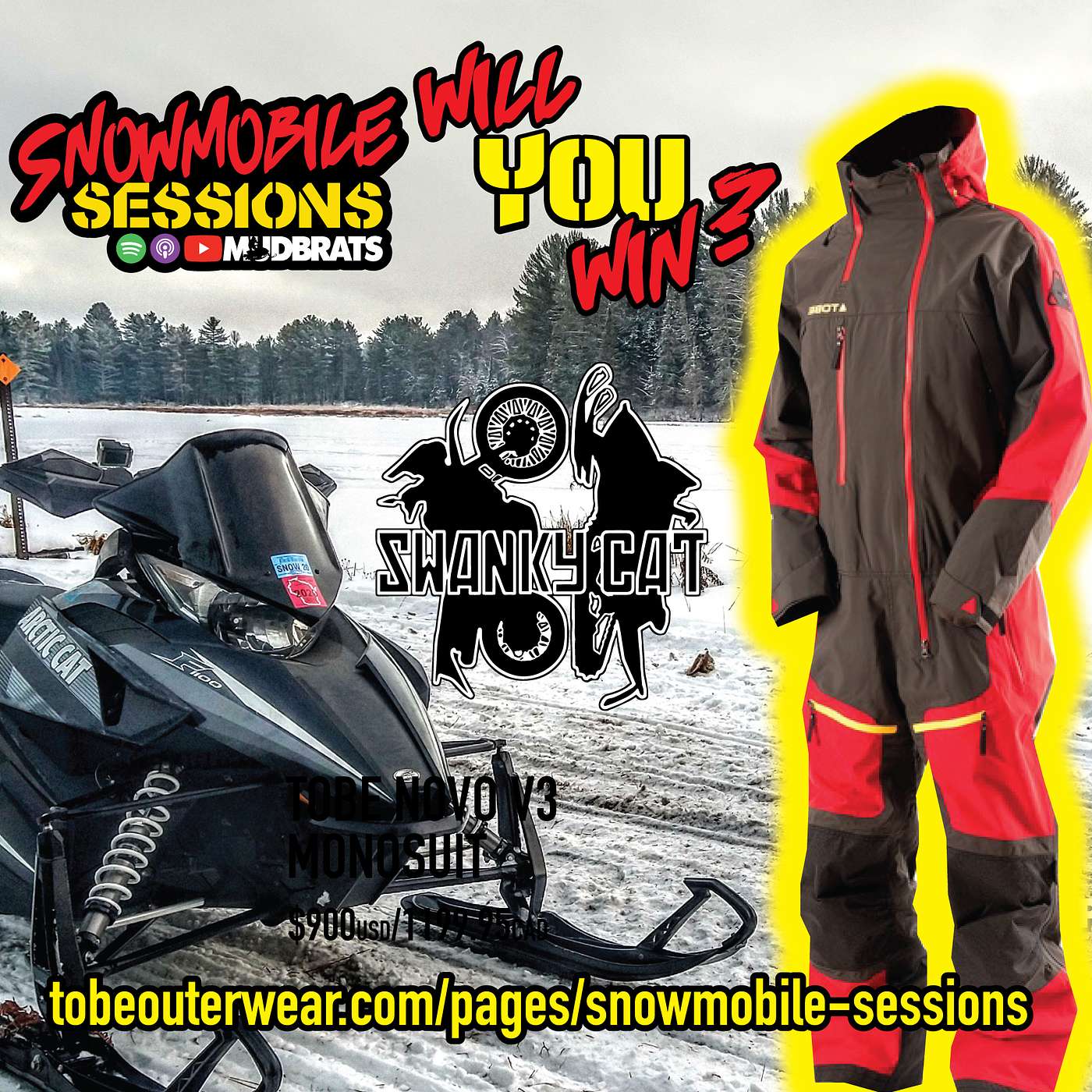 Hey guys we have an amazing announcement - you are not going to believe this announcement! We are giving away - yes, I said giving away a 100% waterproof, 100% windproof TOBE Outerwear Novo V3 Mono Suit! (Cheers from the others, haha). All you have to do is enter at tobeouterwear.com/pages/snowmobile-sessions and we’ll announce the giveaway LIVE on Wednesday Feb 10, 2021 at 12noon EST (whatever time you want to). So again, to enter to win a brand new Novo V3 visit the web address on the screen which is tobeouterwear.com/pages/snowmobile-sessions