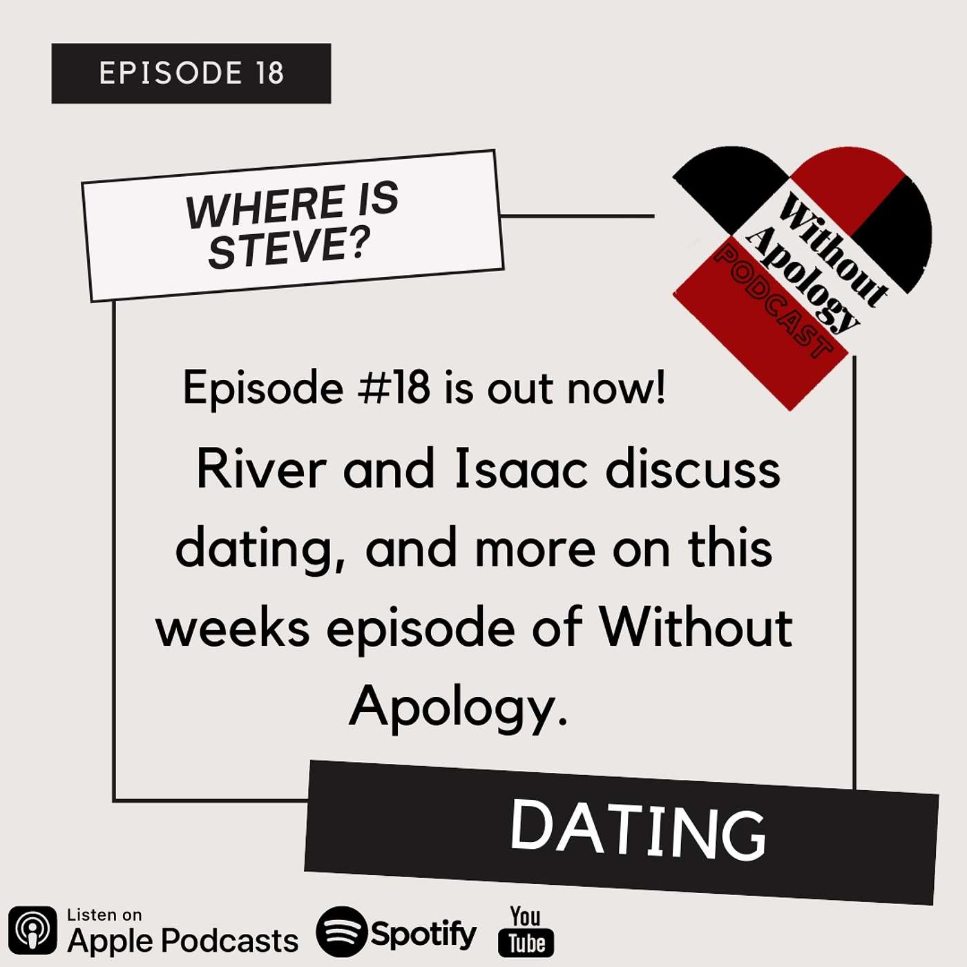 STEVE IS MISSING! Listen to Isaac and River discuss Godly dating, Steves misterious disapperance, whats up with promise rings? All this and more on your favorite podcast, Without Apology!