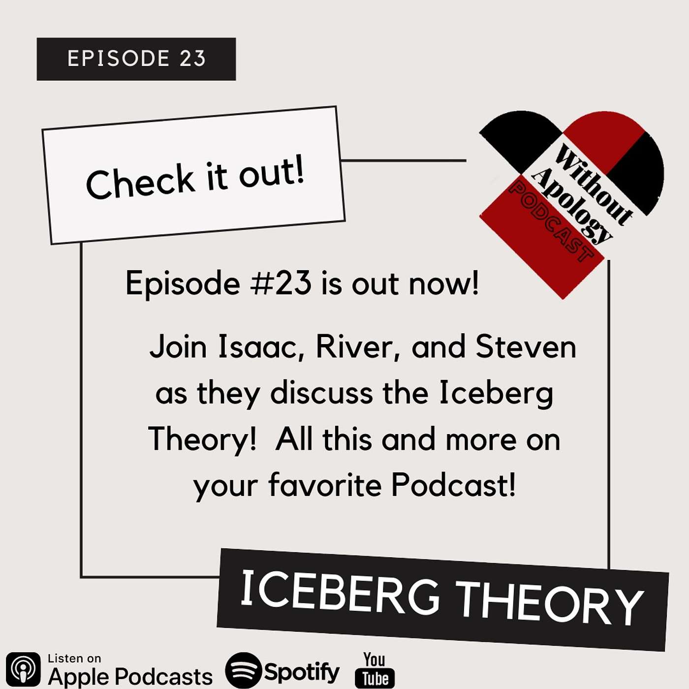 River Harter, Stevan Gamauf and Isaac Bogue discuss the facts that there is always more going on in a person. Using the "Iceberg Theory" the guys discuss how we can better understand eachother and ourselves by understanding that there is always so much more going on below the surface of every individual and how we can never assume why a person is the way they are. All this and more on your favorite podcast, Without Apology.