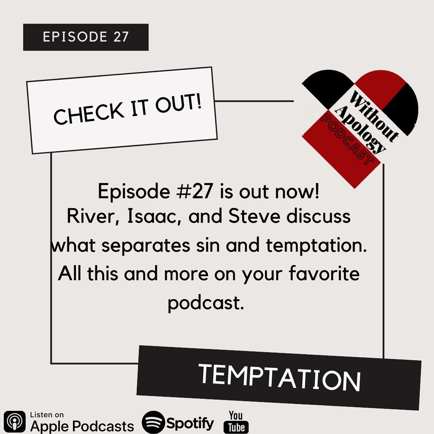Isaac Bogue, River Harter and Steven Gamauf discuss a fan question, "When does temptation become a sin?" In thgis episode the guys look at their own lives as well as the lives of biblical examples of Godly people and how they dealt with temptation. All this and more on your favorite podcast, Without Apology.