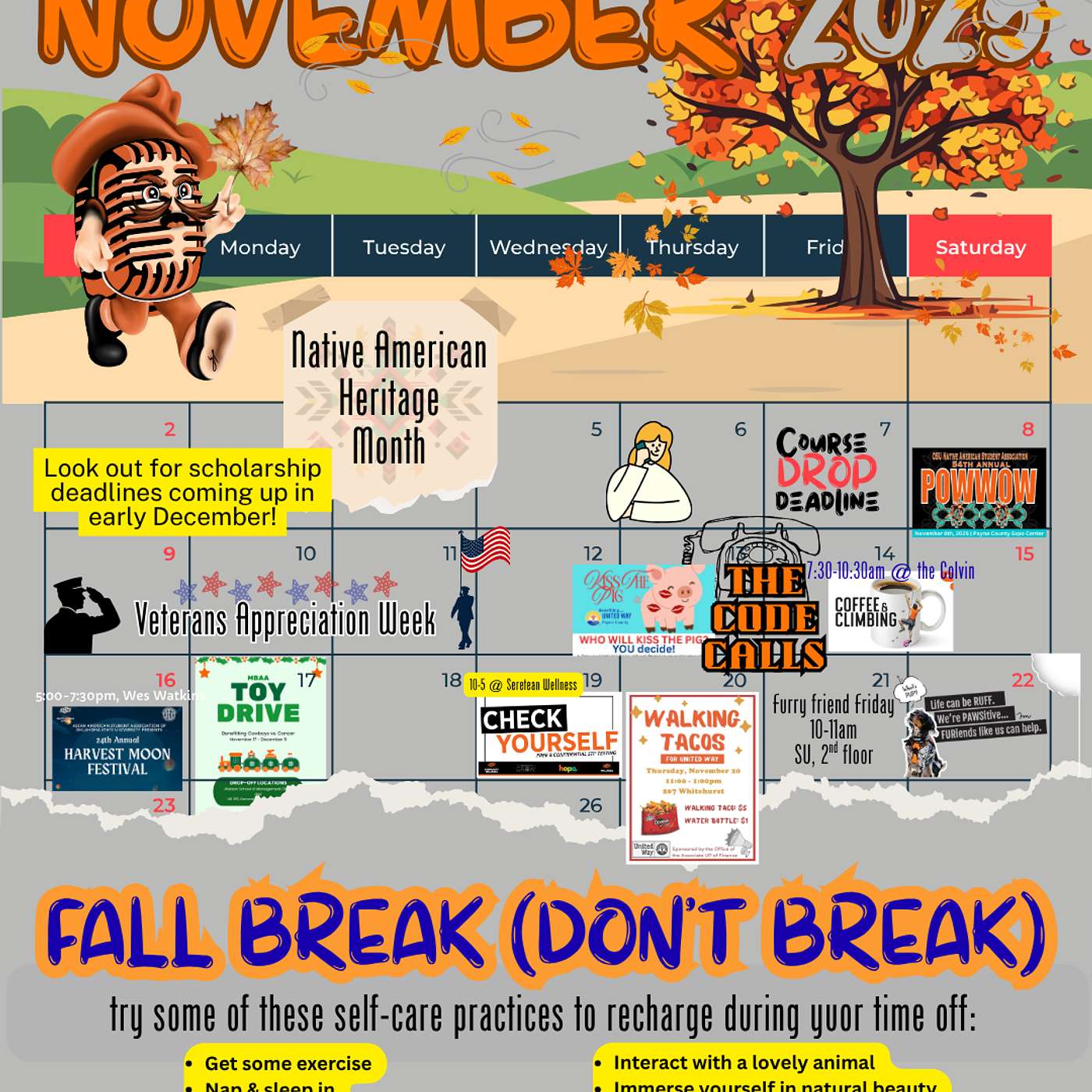 Need a highlight reel for the packed calendar of academic deadlines and cultural and athletic events happening at Oklahoma State in the month of November? Paige and Jennah got you covered! Give a listen for what you should know. A well-earned break is fast approaching, so keep healthy, Pokes, for the busy end of another semester.