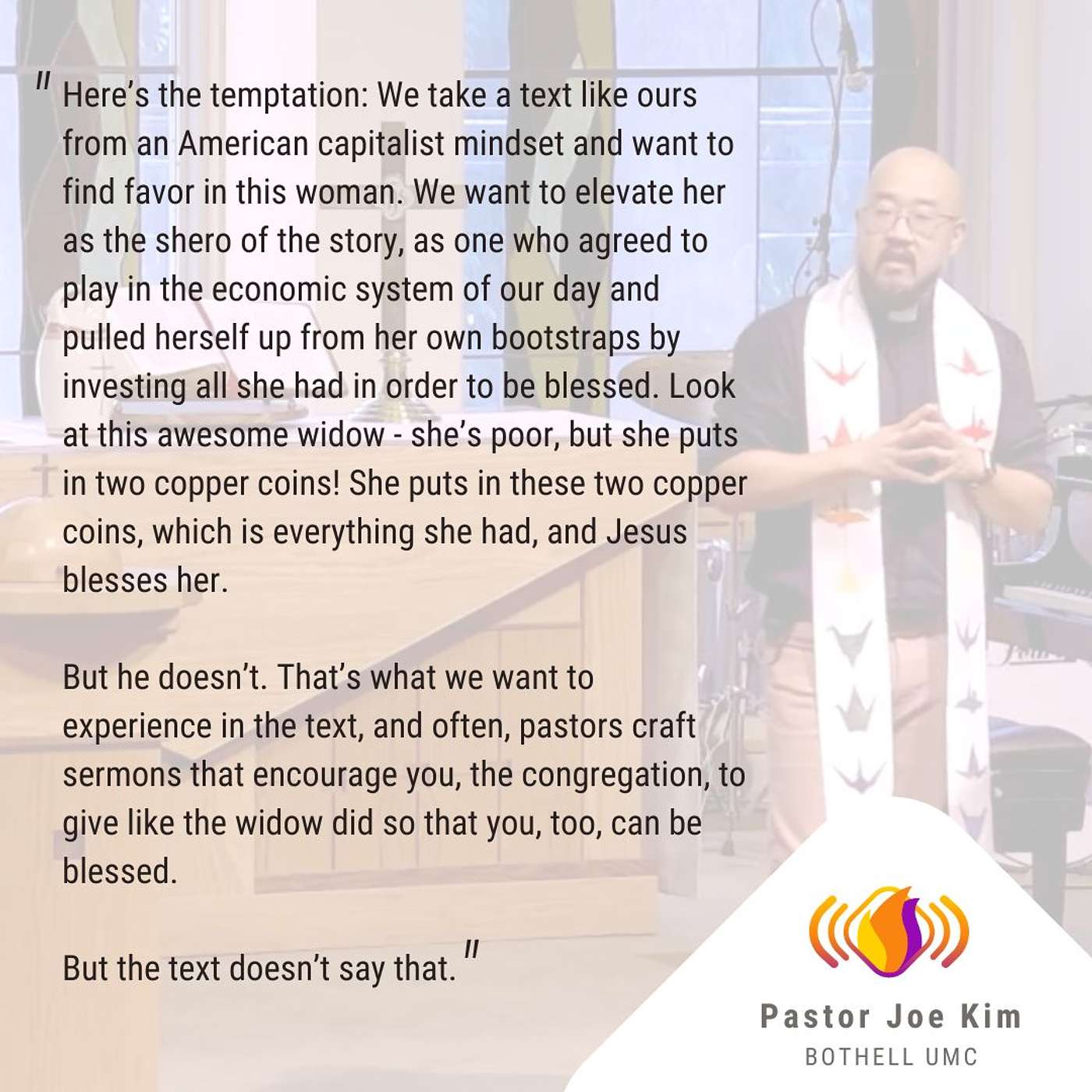 This week, Pastor Joe challenges us to notice the systems that keep people down and our role in revolutionizing the world towards God's preferred future. Reflecting on Mark 12:38-44, he invites us to experience Jesus' words not as a celebration of the widow's giving, but rather a commentary on the system that has failed her.