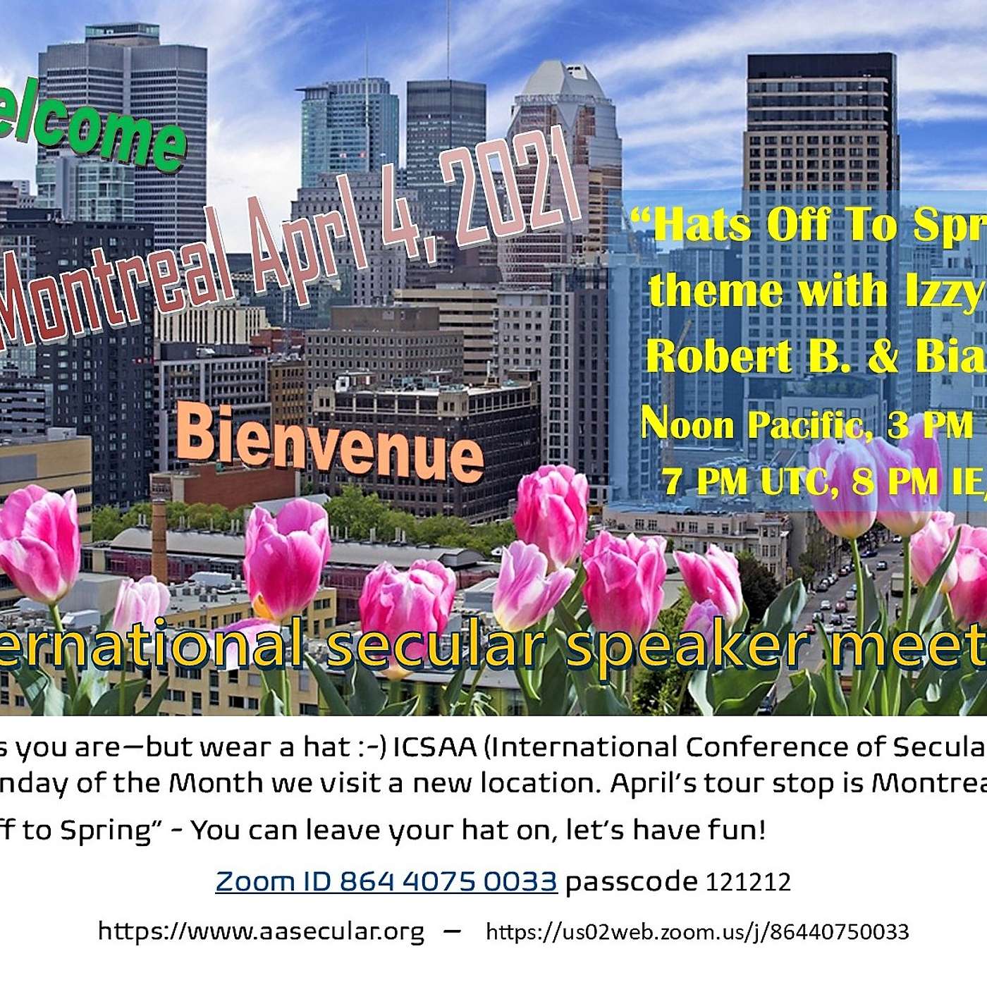 This recording from April 4, 2021 is the fourth monthly International secular AA speaker world tour stop. We’re in Montreal, we’ll hear from Izzy D, Robert B & Bianca. Recorded from the audio of our zoom meeting, what you’re missing is the theme acted out. Hats off to Spring invited attendees to wear a hat and there were some good sports and creative headdressings. The chat is always alive with shared information and humour and I connection. I guess what I’m saying is while I’m sure you’ll enjoy the audio, join us live for a First Sunday of Every Month International Conference of Secular AA events. For more information, google Secular AA or type aasecular.org into your browser. Questions? Email us at SecularAA@gmail.com